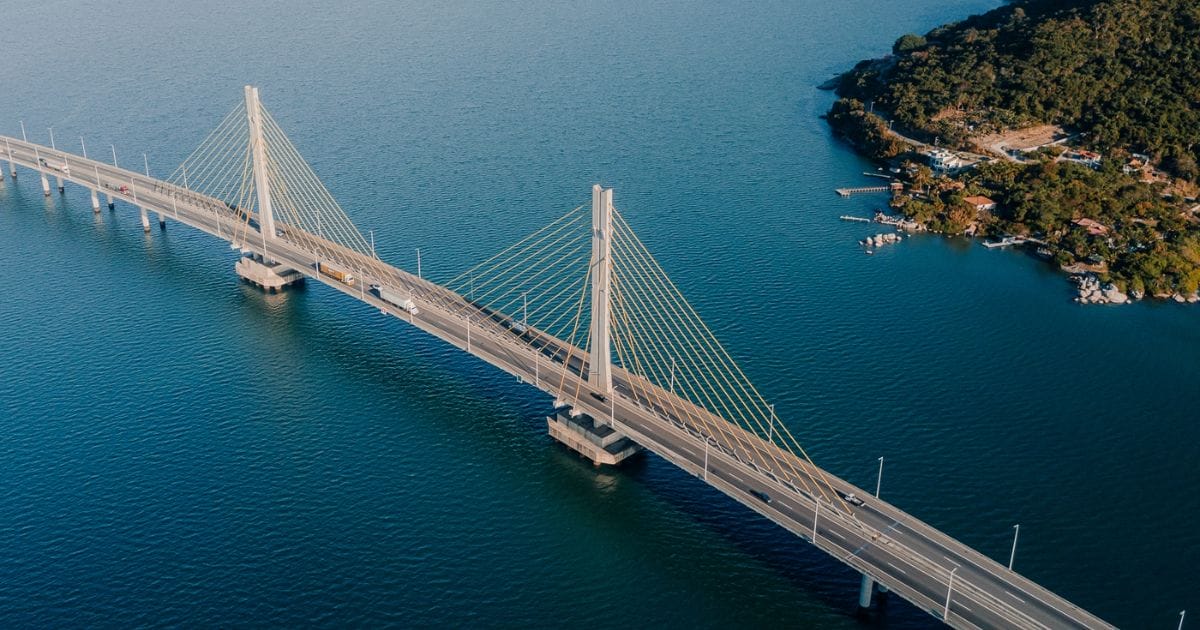 Cartão-postal de Laguna, a ponte Ponte Anita Garibaldi cruza a Lagoa Santo Antônio dos Anjos e é uma das maiores estruturas do tipo estaiada no Brasil (Foto: Secretaria de Turismo e Lazer de Laguna, Reprodução)