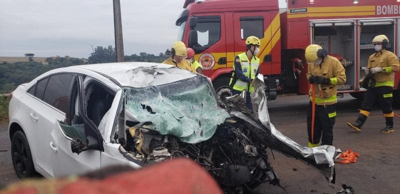 Um grave acidente entre um carro e uma carreta causou a morte súbita de um motorista de 23 anos e deixou outra pessoa presa às ferragens na tarde deste sábado (24) no contorno viário de Chapecó, no Oeste catarinense. A vítima que sobreviveu à colisão foi retirada dos escombros sem ferimentos graves, segundo o Corpo de Bombeiros Militar.
