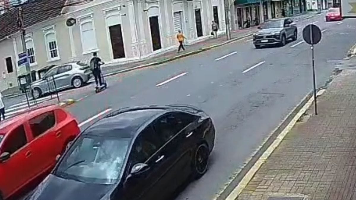 A idosa conta que caminhava pela Rua Doutor João Colin quando viu que o semáforo havia ficado vermelho para os carros. Neste momento, ela tentou atravessar a via. Após sair da calçada e dar um passo na rua, foi atingida pelo patinete que vinha na via do ônibus, na contramão.