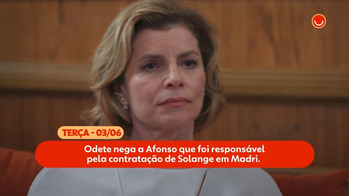 Afonso diz a Solange que a acusação contra Odete é grave e que a ex-namorada precisará prová-la. Solange não gosta de saber que Sardinha alugou o terceiro quarto para Mário Sérgio, um jornalista recém-contrato da Tomorrow. Solange volta para a agência. Odete combina com Marco Aurélio como será a reunião com Afonso. Odete nega a Afonso que foi responsável pela contratação de Solange em Madri. Poliana vai à casa de Heleninha para assinar o contrato. Marco Aurélio fica sensibilizado com as atitudes de Sarita. Maria de Fátima fica impactada com uma decisão que Afonso toma. Marco Aurélio diz a Laís que os médicos não sabem quando Cecília sairá do coma. Solange e Afonso se encontram.