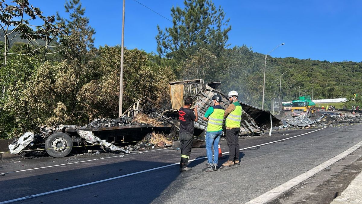Além da van, duas carretas se envolveram na batida. Um dos caminhões pegou fogo e o acidente causou a interdição total da via sentido Sul. Não há previsão para liberação da pista. As filas no local já ultrapassam 20 quilômetros. Segundo a Arteris Litoral Sul, é possível fazer um desvio pela BR-116.