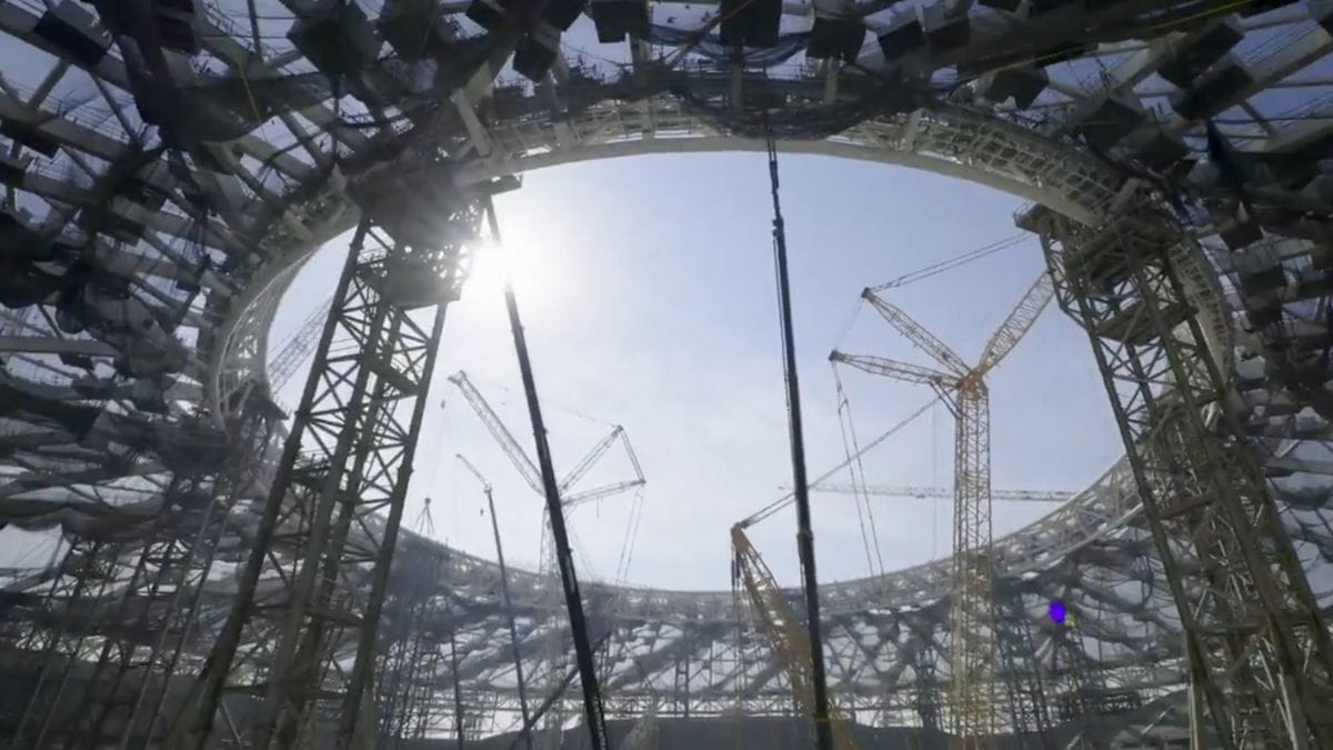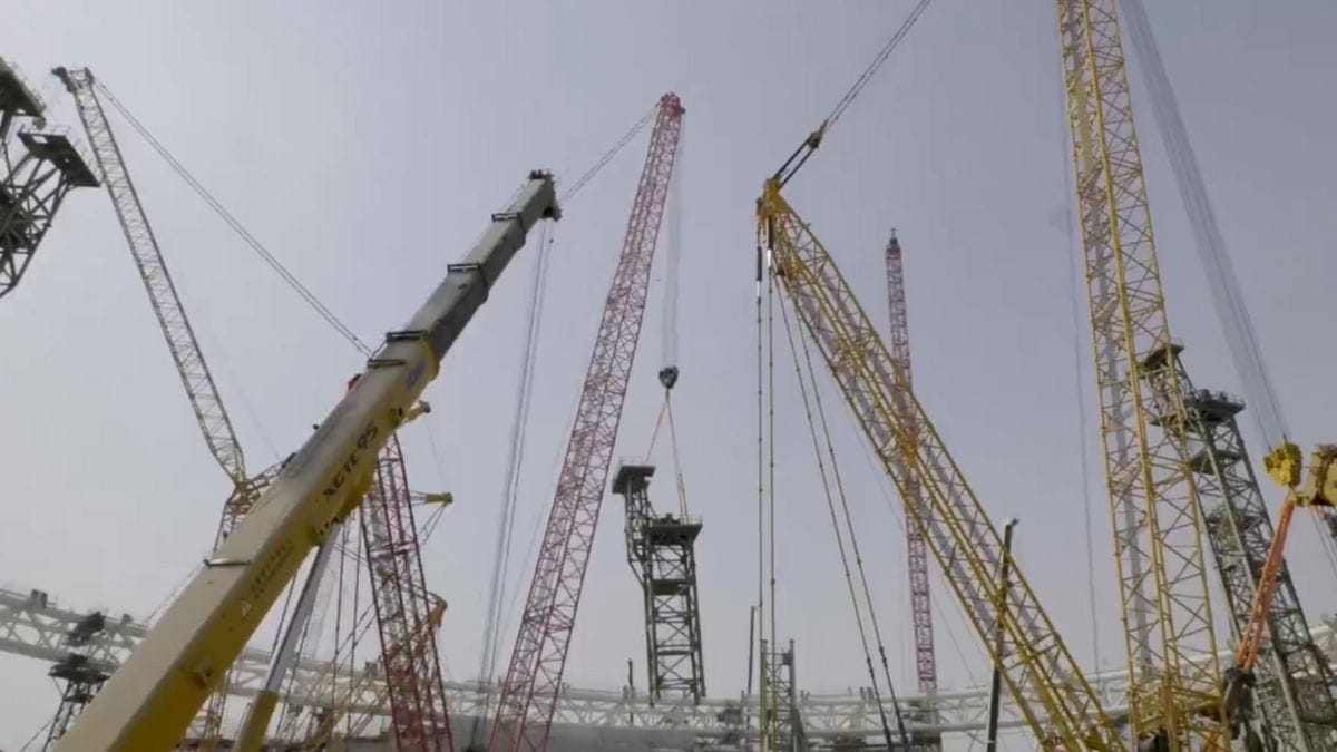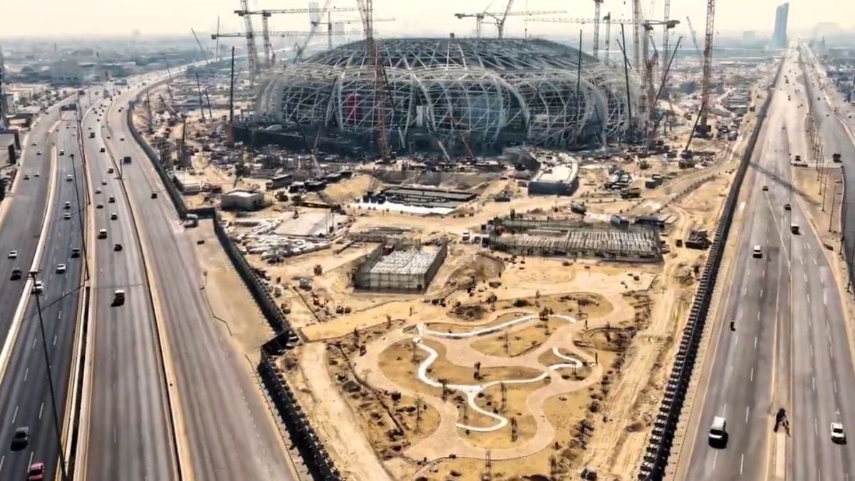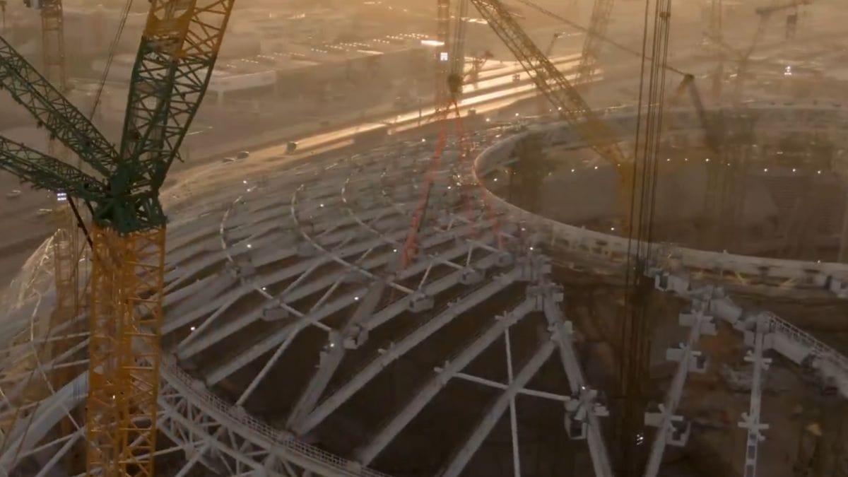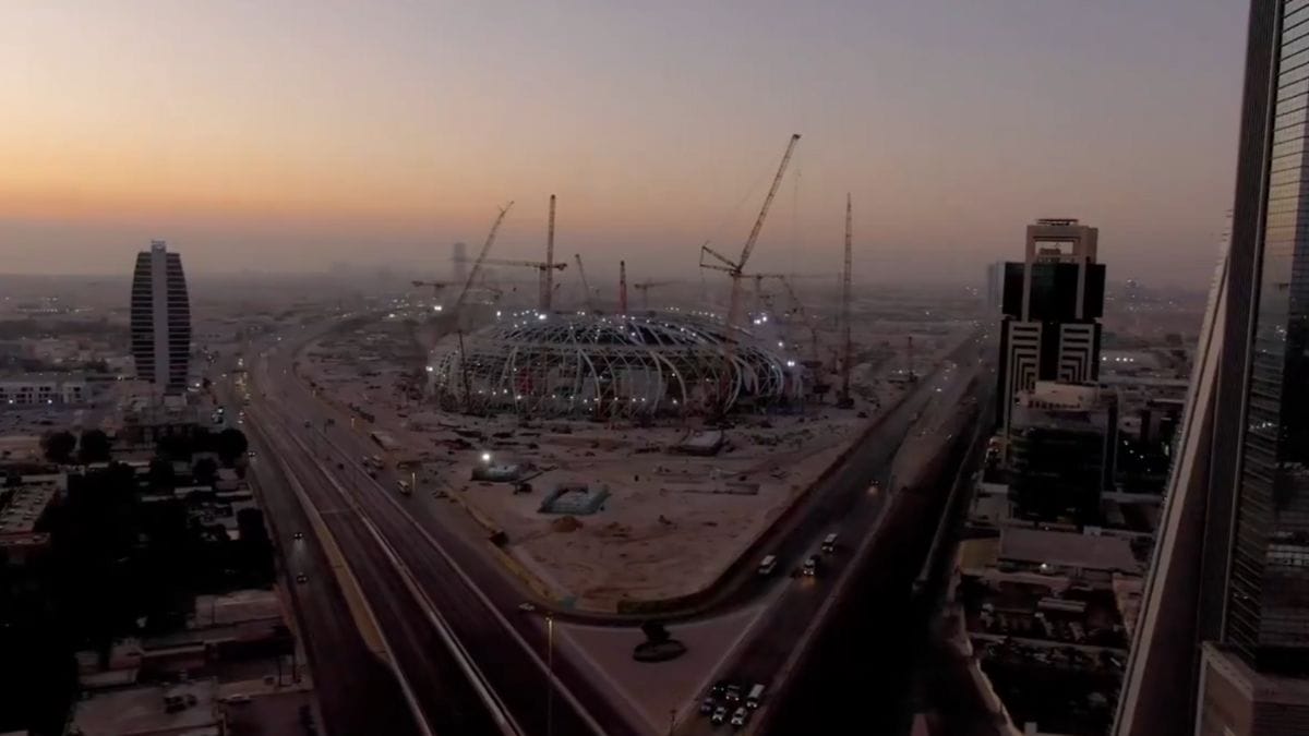 A obra de construção do estádio Aramco, no Norte de Khobar, chegou na etapa de instalação da imponente cobertura da arquibancada no fim de 2025. O local será um dos palcos da Copa do Mundo de 2034.
