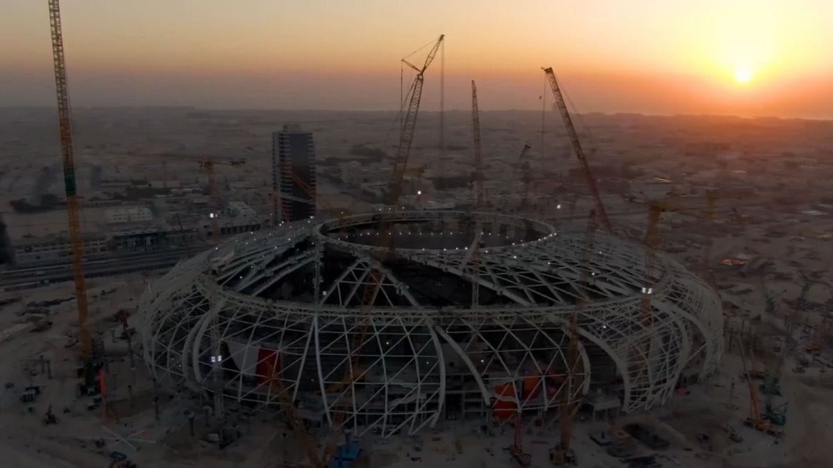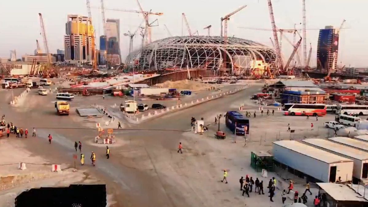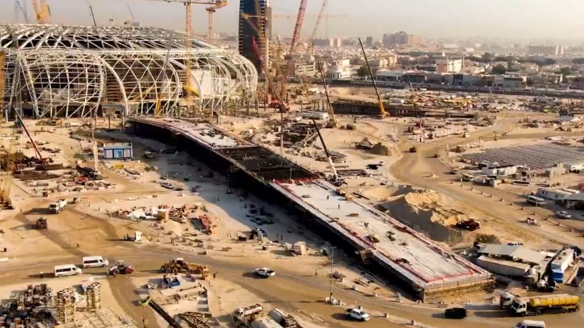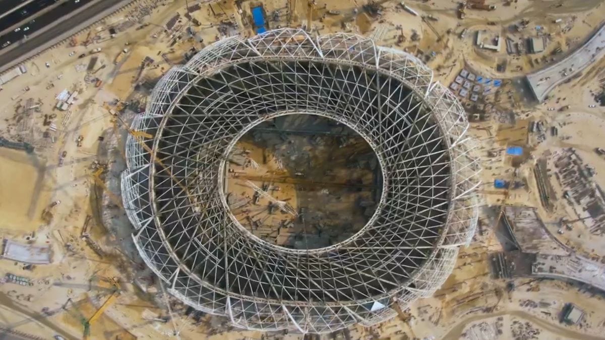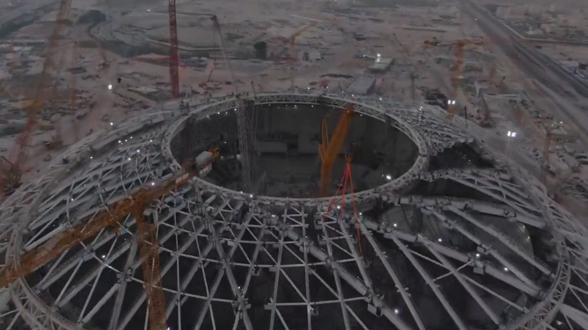 A obra de construção do estádio Aramco, no Norte de Khobar, chegou na etapa de instalação da imponente cobertura da arquibancada no fim de 2025. O local será um dos palcos da Copa do Mundo de 2034.