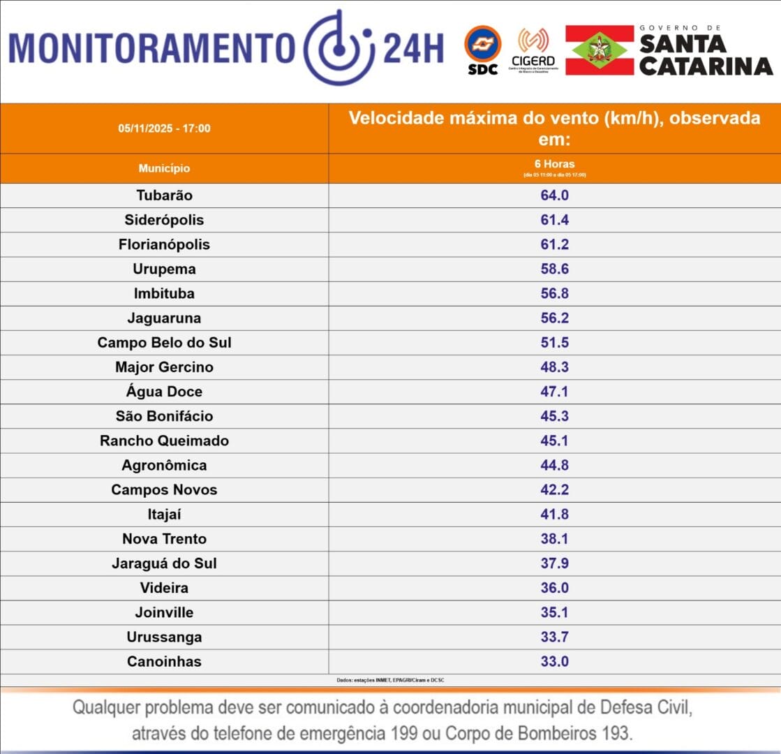 Entre às 11h e às 17h desta quarta, as maiores rajadas de vento foram registradas na cidade de Tubarão, com 64 km/h, seguida de Siderópolis, com 61,4 km/h e Florianópolis, com 61,2 km/h.