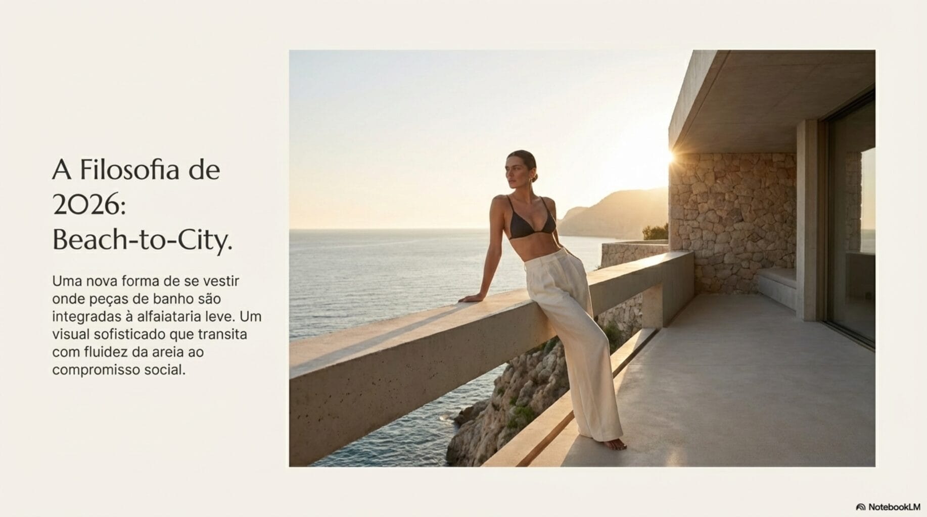 A grande tendência da temporada é o estilo “Beach-to-City”, onde peças de banho são integradas a itens de alfaiataria leve, garantindo um visual sofisticado que transita da areia ao compromisso social.