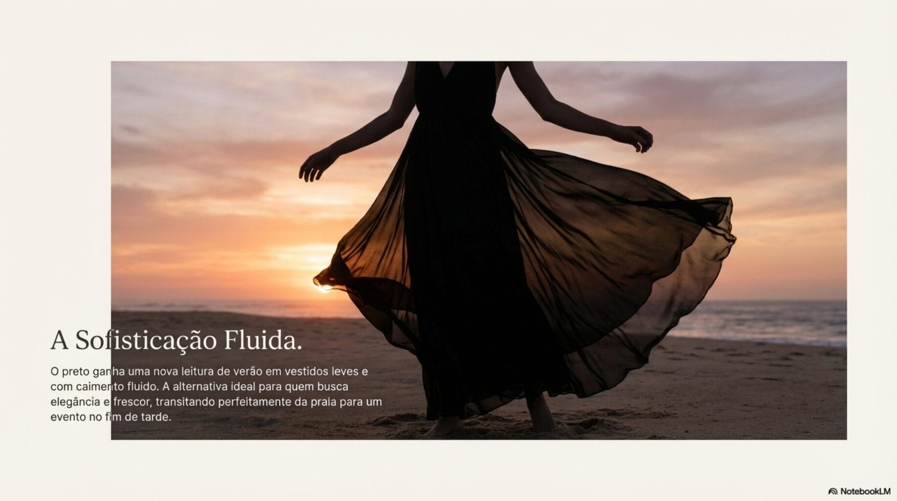 Mesmo associado a looks mais urbanos, o preto ganha outra leitura no verão quando aparece em vestidos leves e com caimento fluido.