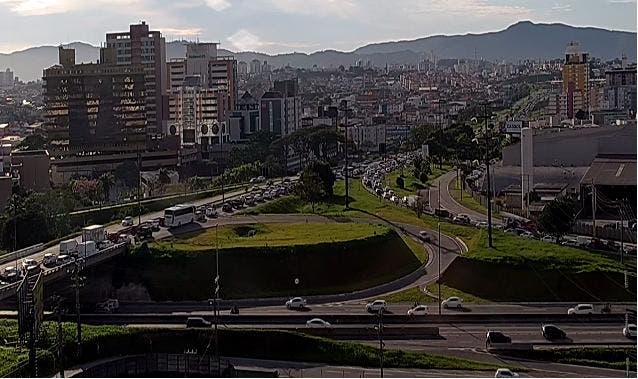 Na região central de Florianópolis, o fluxo de veículos é intenso na Beira-mar Norte, sem engarrafamento durante as primeiras horas da manhã.
