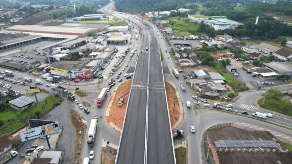 O próximo viaduto da obra de duplicação da BR-470 em Blumenau que será entregue é o do trevo do Badenfurt, no acesso a Pomerode. Com os trabalhos na reta final, o DNIT já tem uma data aproximada para a liberação: a segunda quinzena de junho. Além dele, há outras quatro estruturas que precisam ser finalizadas ou construídas do zero até 2026, quando o órgão pretende concluir todo o serviço.