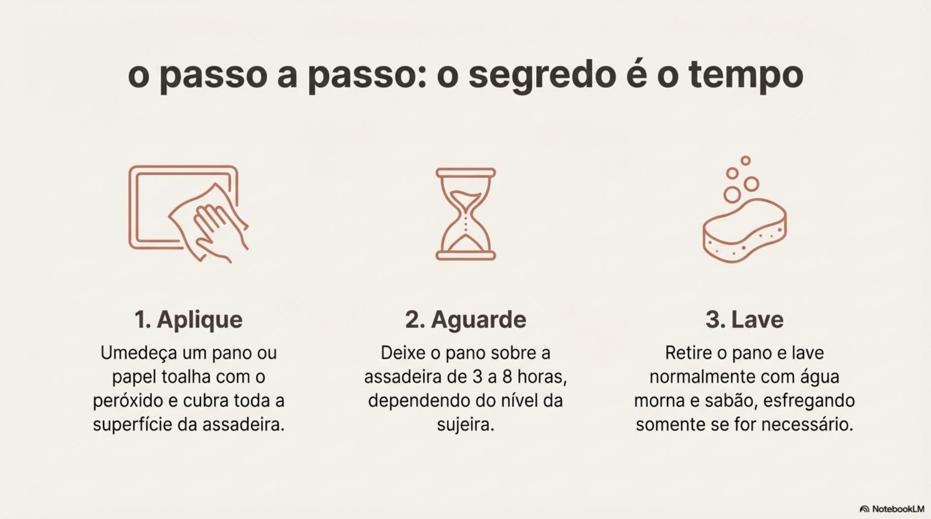 Umedeça um pano ou papel toalha com peróxido e esfregue a superfície da assadeira para espalhar o produto. Depois deixe esse pano ou papel sobre a assadeira, mantendo-a coberta durante um período de três a oito horas, dependendo do nível de sujeira.