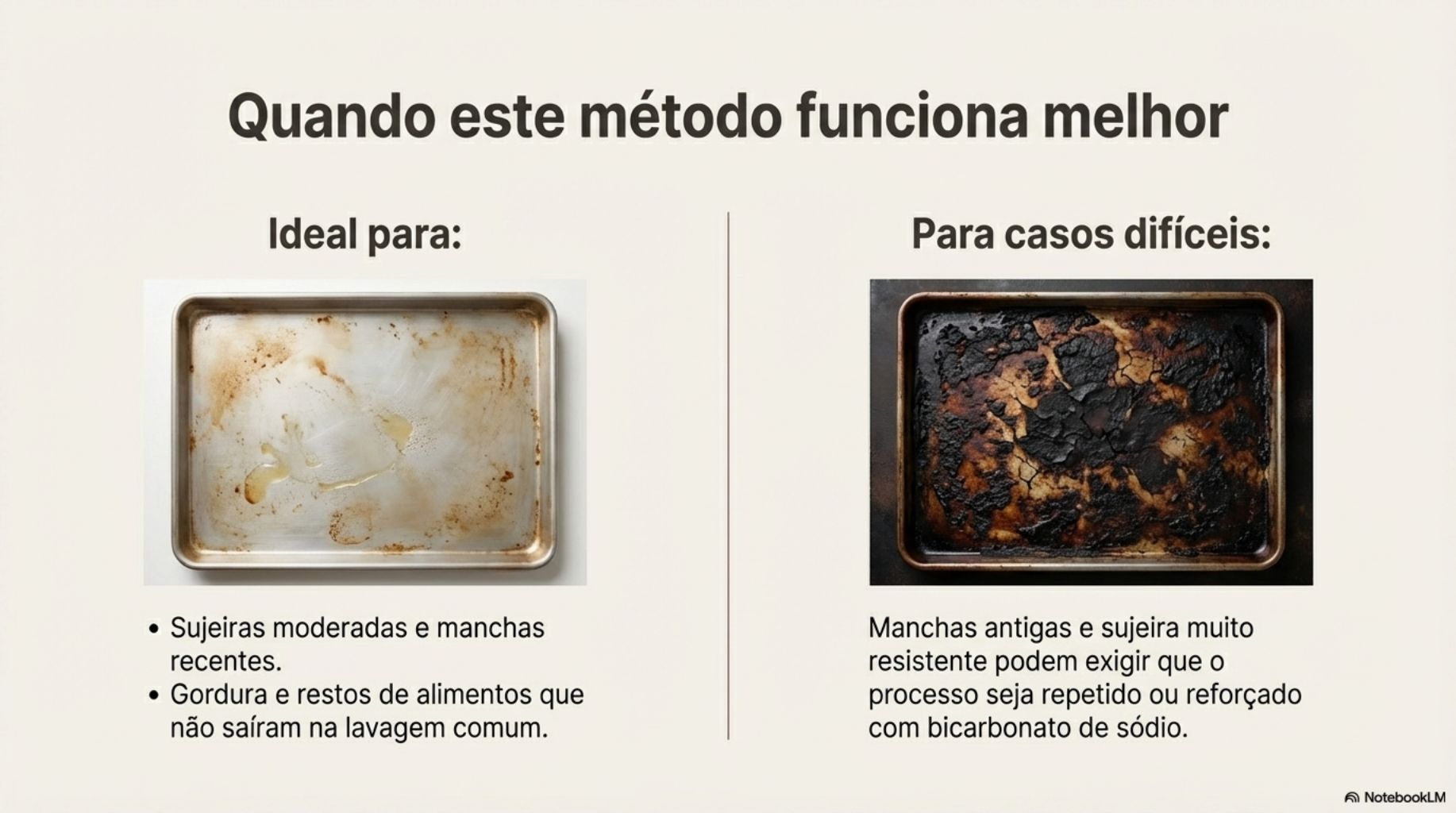 Para manchas antigas ou sujeira muito resistente, pode ser que seja necessário repetir o processo ou usar a técnica reforçada com bicarbonato.