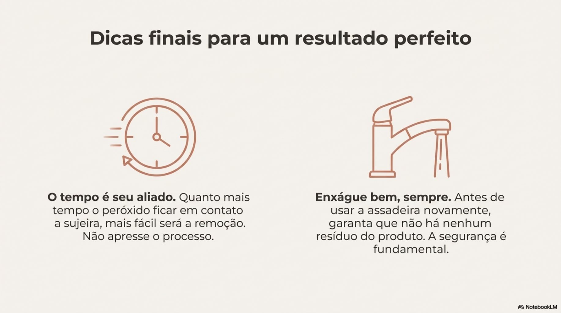 Deixar o peróxido agir por um tempo longo é fundamental para bons resultados. Quanto mais tempo ele ficar em contato com a sujeira, mais fácil será removê-la depois.