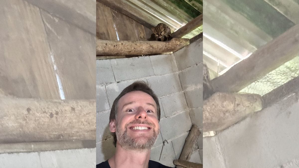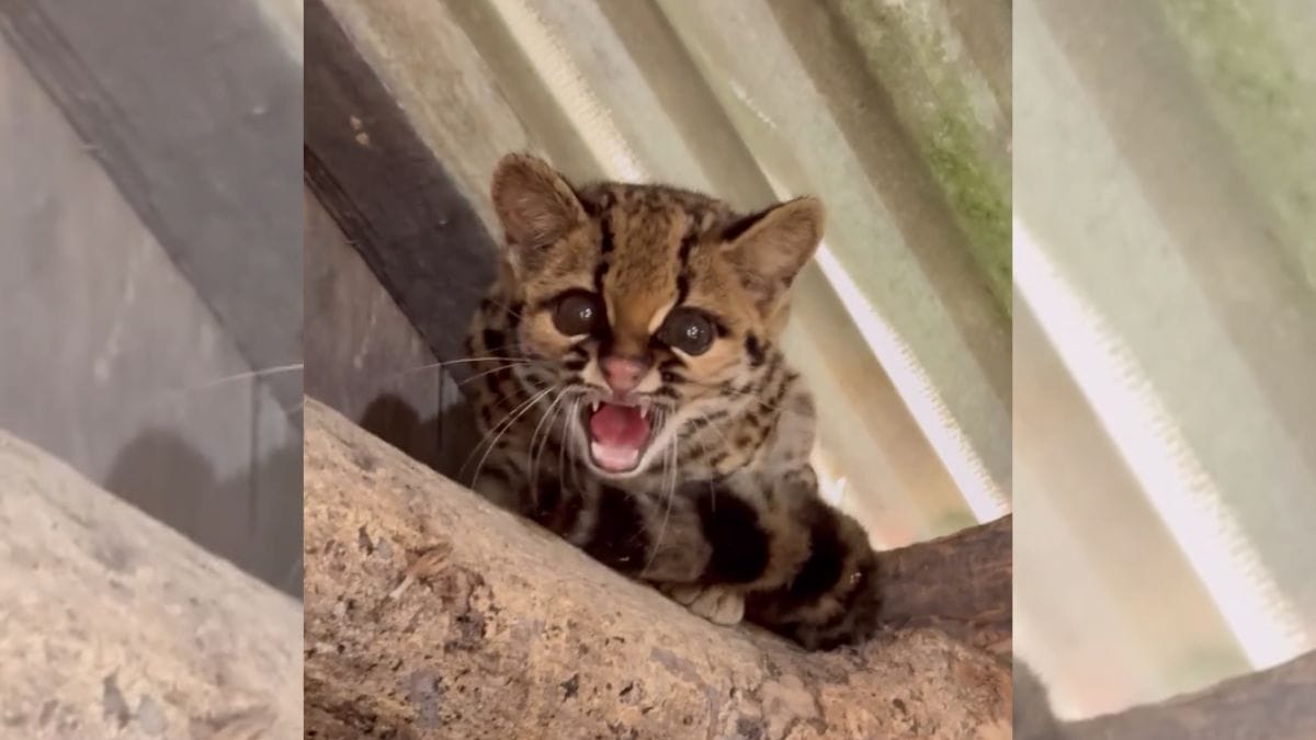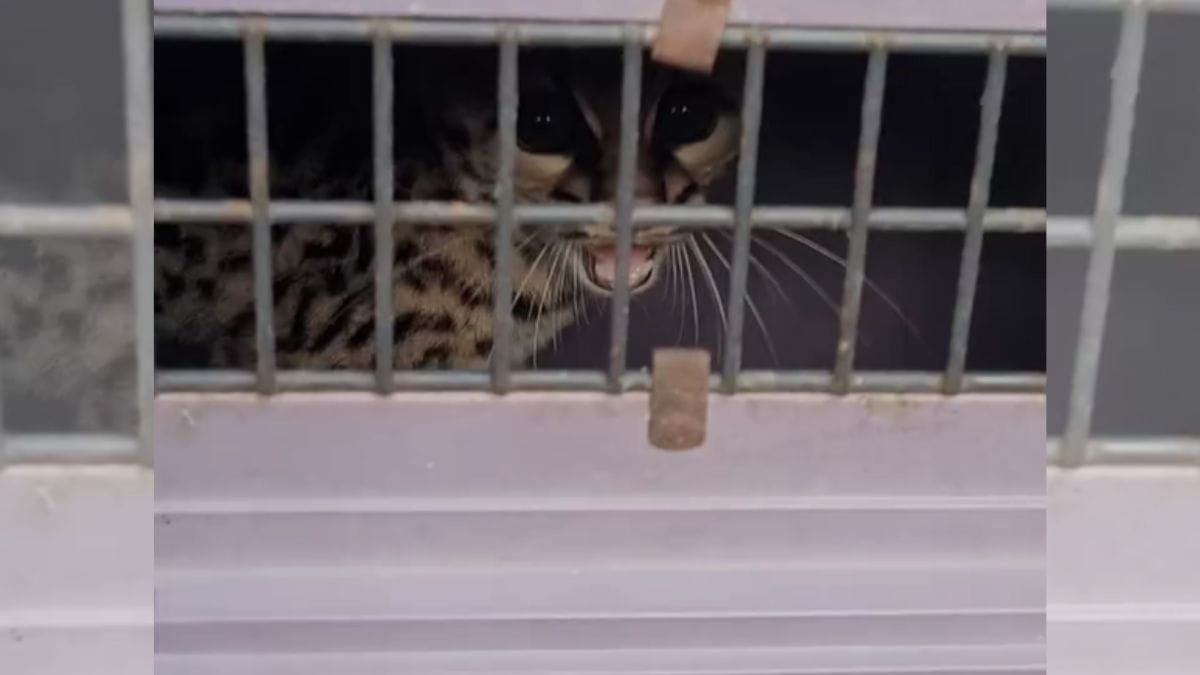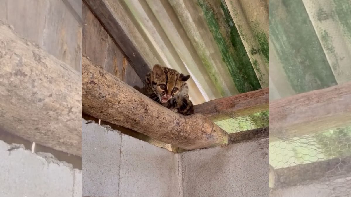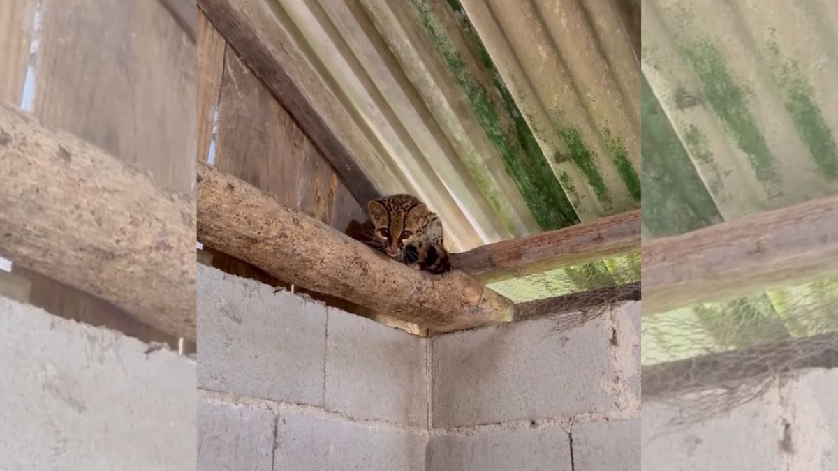 Quando o biólogo Christian Raboch Lempek chegou na propriedade, o animal estava escondido na parte de cima do galinheiro. O profissional pondera que o gato-maracajá deve ter invadido o ambiente para caçar uma galinha.