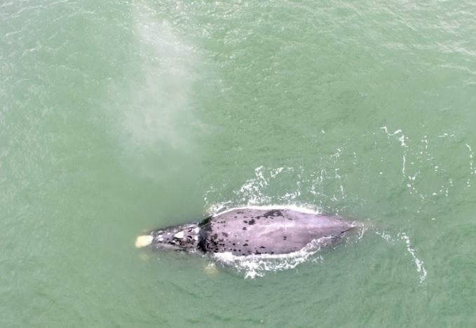 Nas imagens do animal registrado neste fim de semana é possível ver a principal característica das baleias-franca semi-albinas, as pintas pretas. Este mamífero nasce branco com pintas pretas e escurece com o passar dos anos, ficando com a coloração acinzentada.