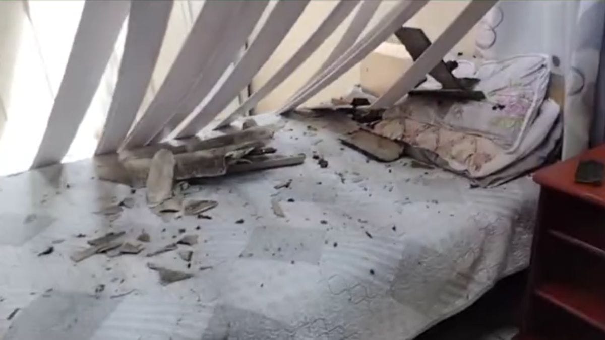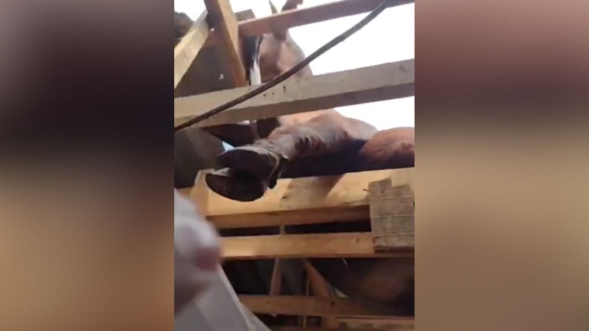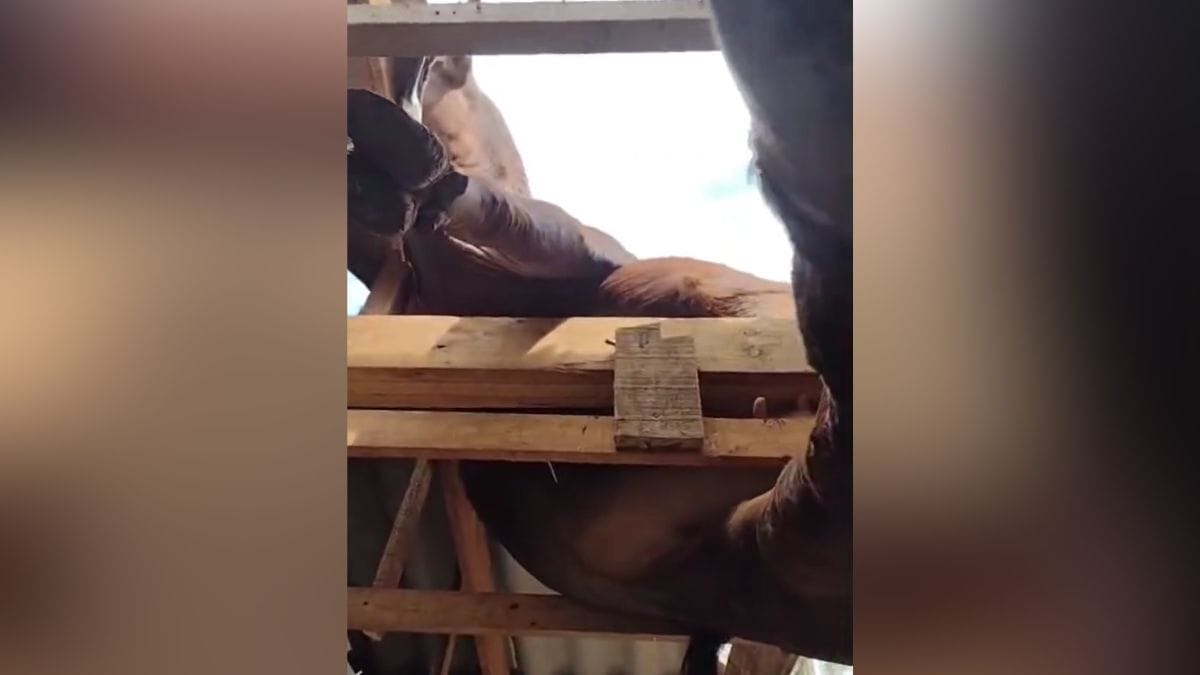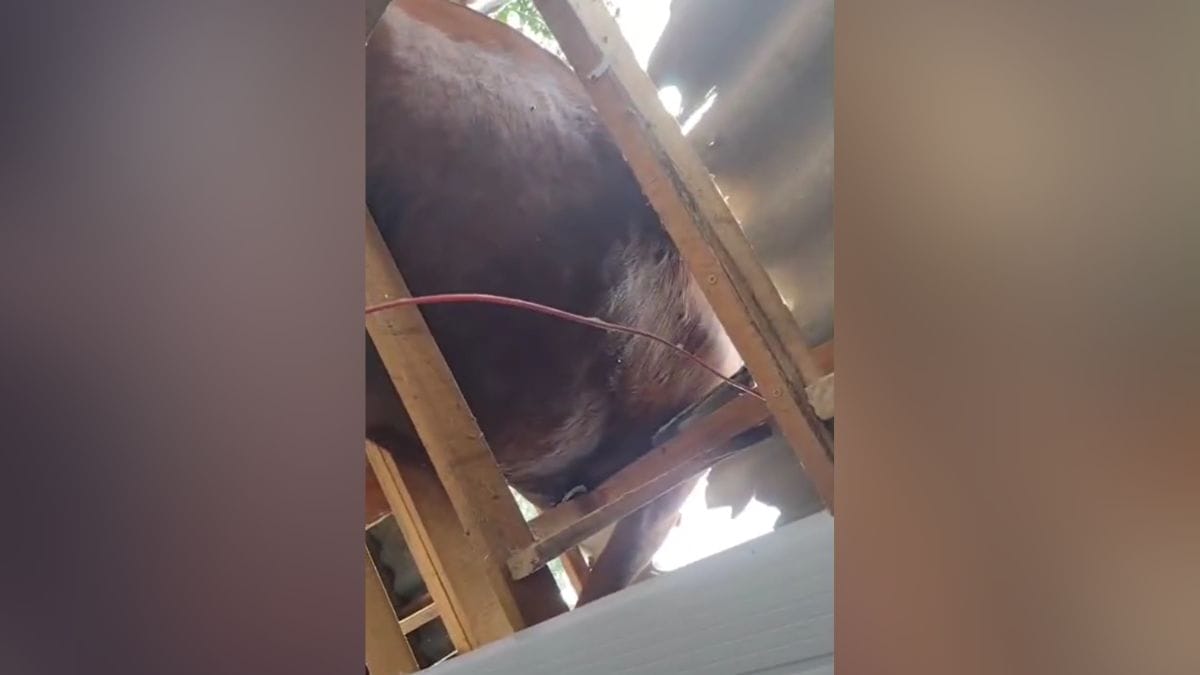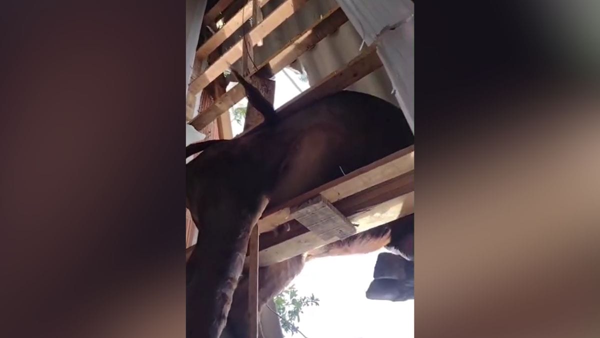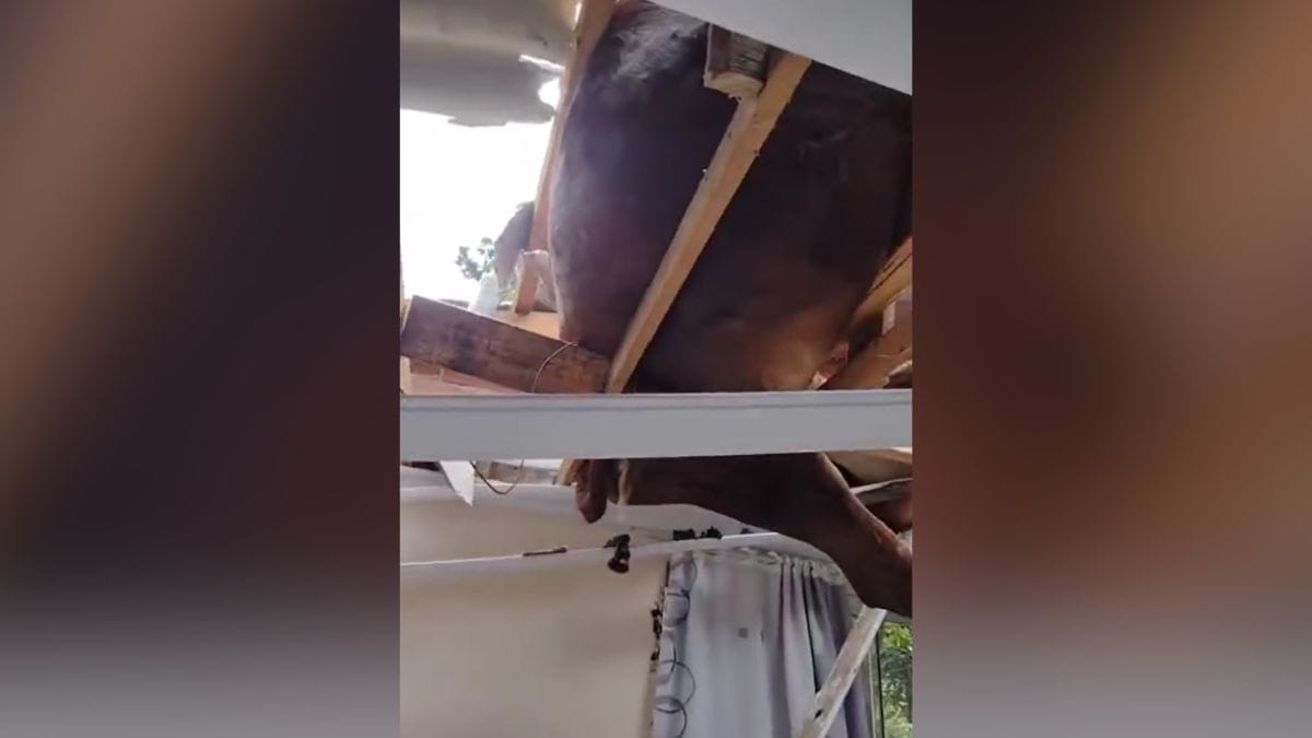 O forro do imóvel, assim como algumas madeiras, cederam e caíram dentro de um dos quartos. O boi, então, ficou pendurado por sarrafos.