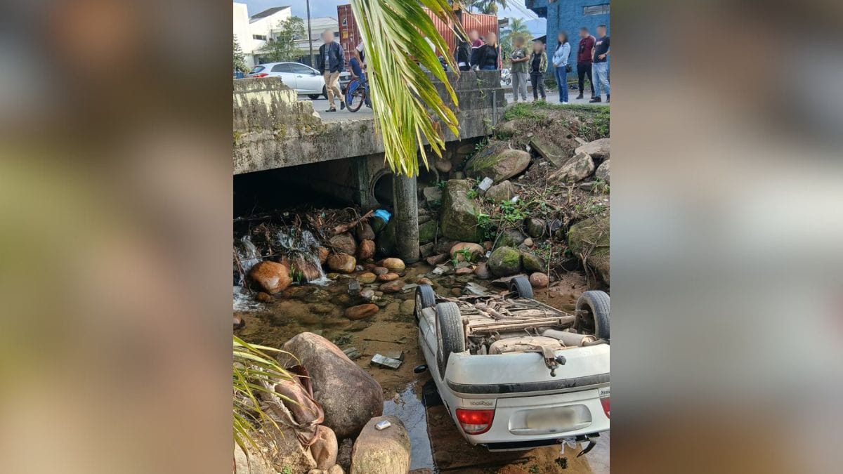 Um carro foi parar dentro de um rio após acidente em Garuva, no Norte de Santa Catarina, na manhã desta terça-feira (19). A colisão entre dois veículos aconteceu às 7h57min em um cruzamento da região central da cidade. Uma câmera de segurança flagrou o momento em que o Renault Megane colide contra uma mureta de contenção no local.