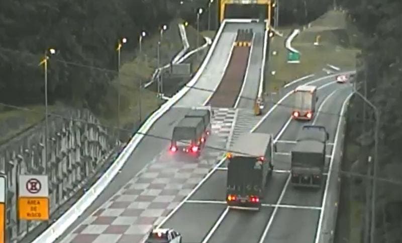 O trecho de serra da BR-376 com sentido a Santa Catarina registrou duas saídas de caminhões para uma área de escape na altura de Guaratuba (PR) nesta quarta-feira (15). As cenas foram registradas por câmeras de segurança no local.