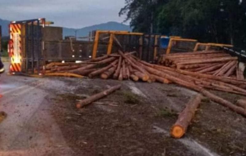 Uma carreta que transportava toras de madeira tombou na BR-282, em Santo Amaro da Imperatriz, Grande Florianópolis, na manhã desta quinta-feira (21). O acidente ocorreu nas proximidades do Trevo de Varginha, no km 28,5 da rodovia, às 6h.