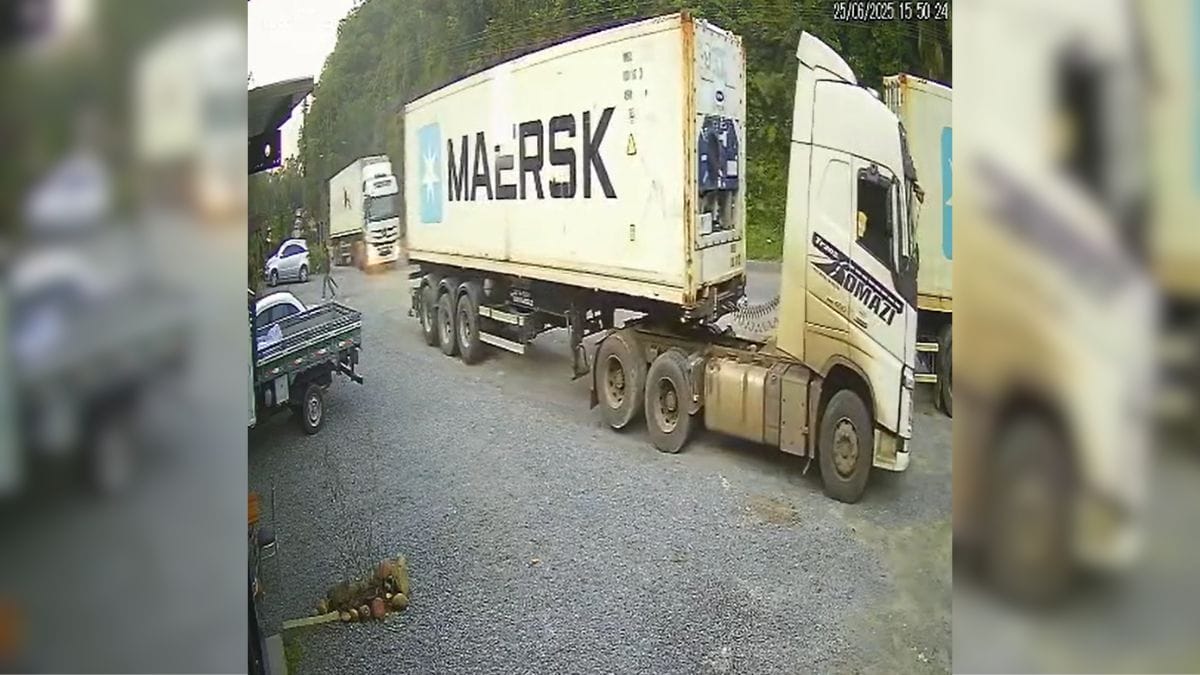 Nesse momento, a última carreta que chegou no local começa a descer a serra. O veículo quase colide em um carro estacionado, bate em uma estrutura e vira em “L” no meio da rodovia. Os caminhoneiros que já estavam fora dos veículos correm para tentar parar a carreta, mas sem sucesso.