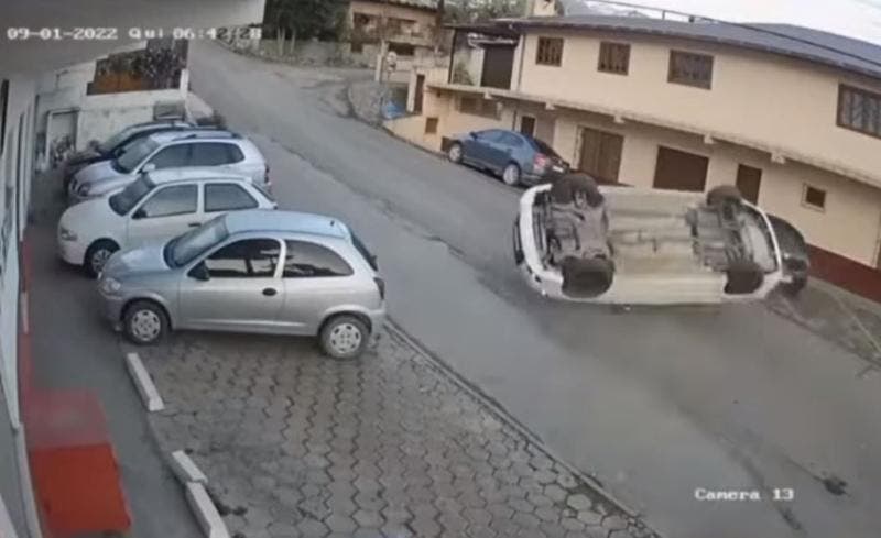 Um carro desgovernado capotou e foi parar em uma vaga de estacionamento após bater em outro veículo em São Bento do Sul, no Planalto Norte de Santa Catarina. O acidente aconteceu por volta de 6h40 desta quarta-feira (1) e foi flagrado pela câmera de segurança de um estabelecimento.