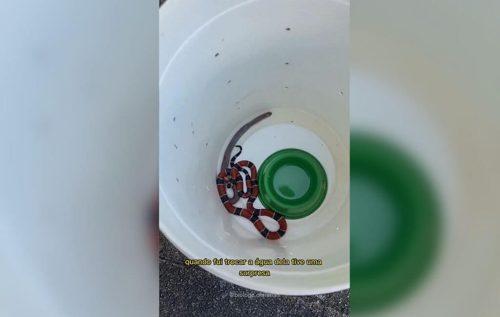 Em outra ocasião, no ano passado, o também biólogo da Fujama, Gilberto Duwe, flagrou outra cobra-coral verdadeira regurgitando uma serpente. O profissional havia resgatado a cobra.