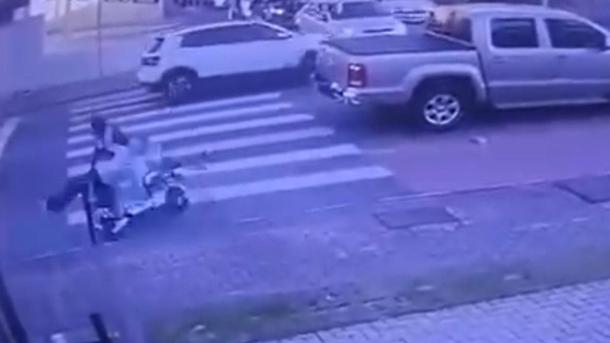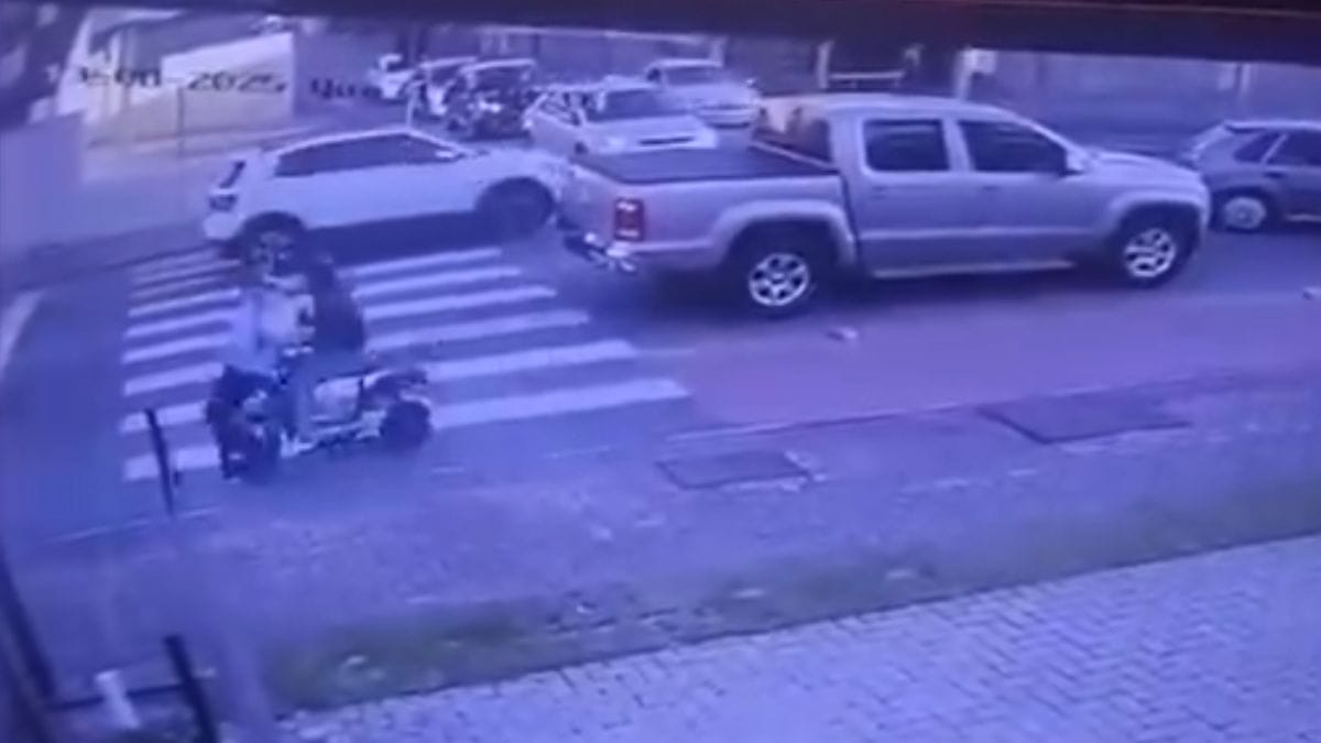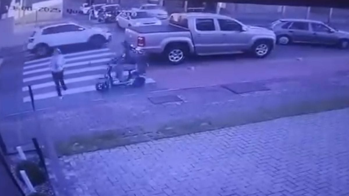 As imagens da câmera de segurança mostram a mulher atravessando a rua pela faixa de pedestres. Quando estava a poucos centímetros da calçada, foi atingida pela moto elétrica que transitava no sentido oposto do tráfego de veículos.