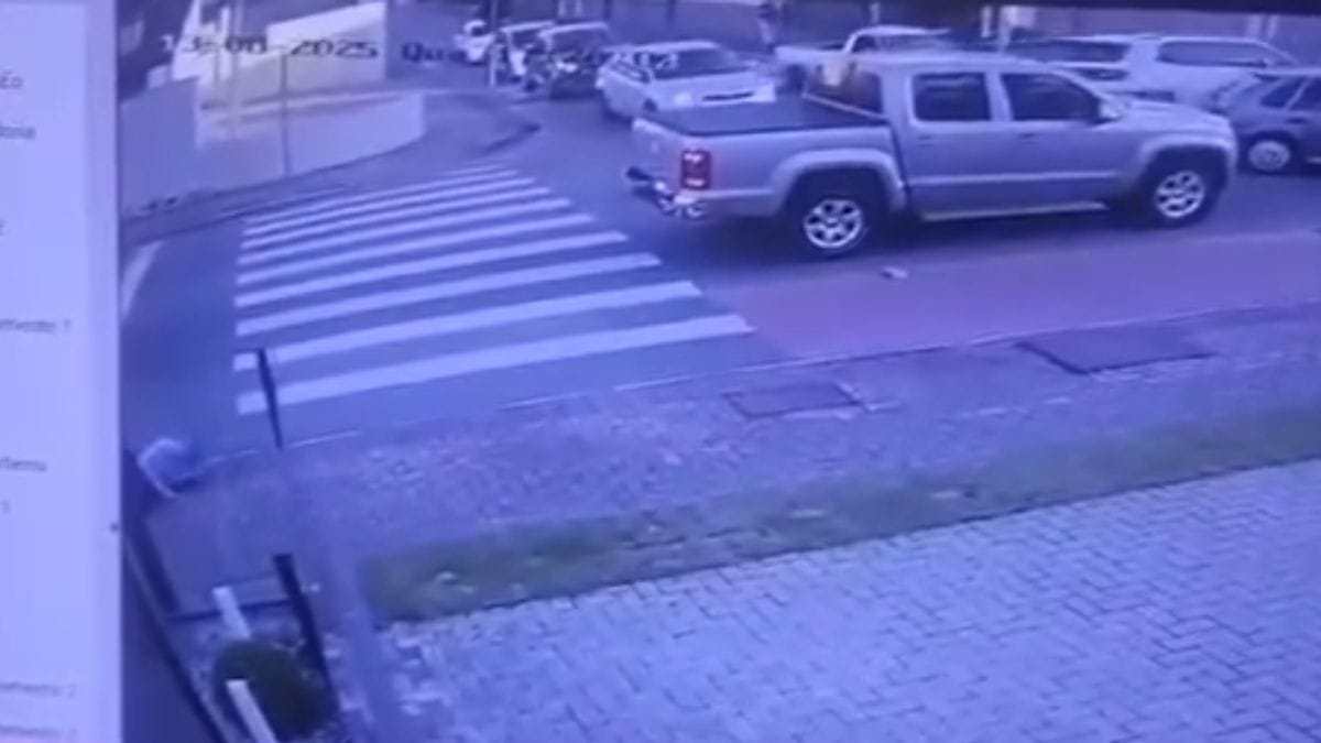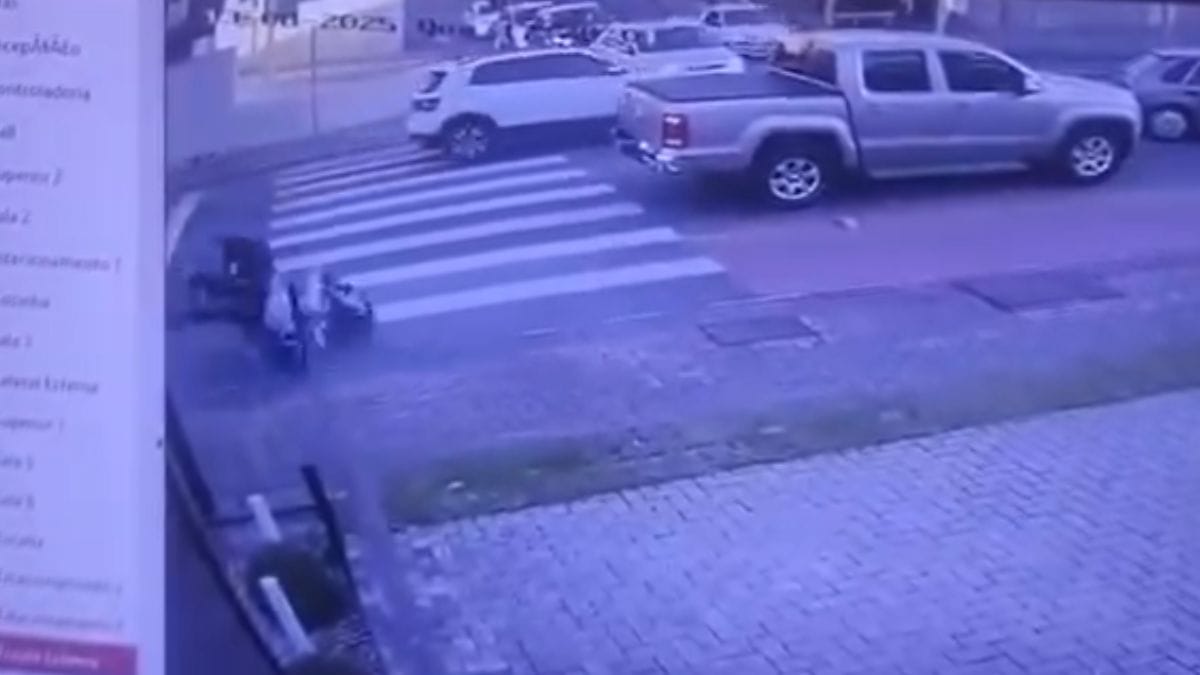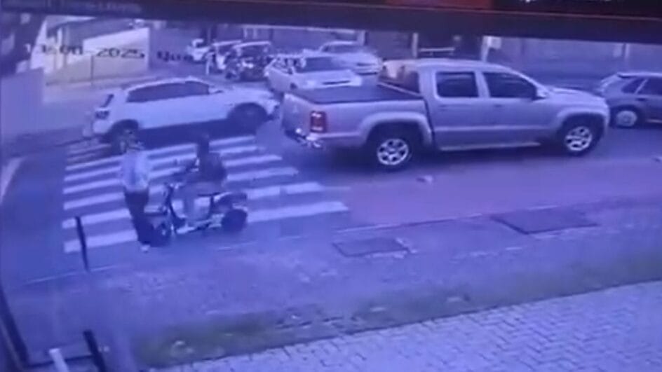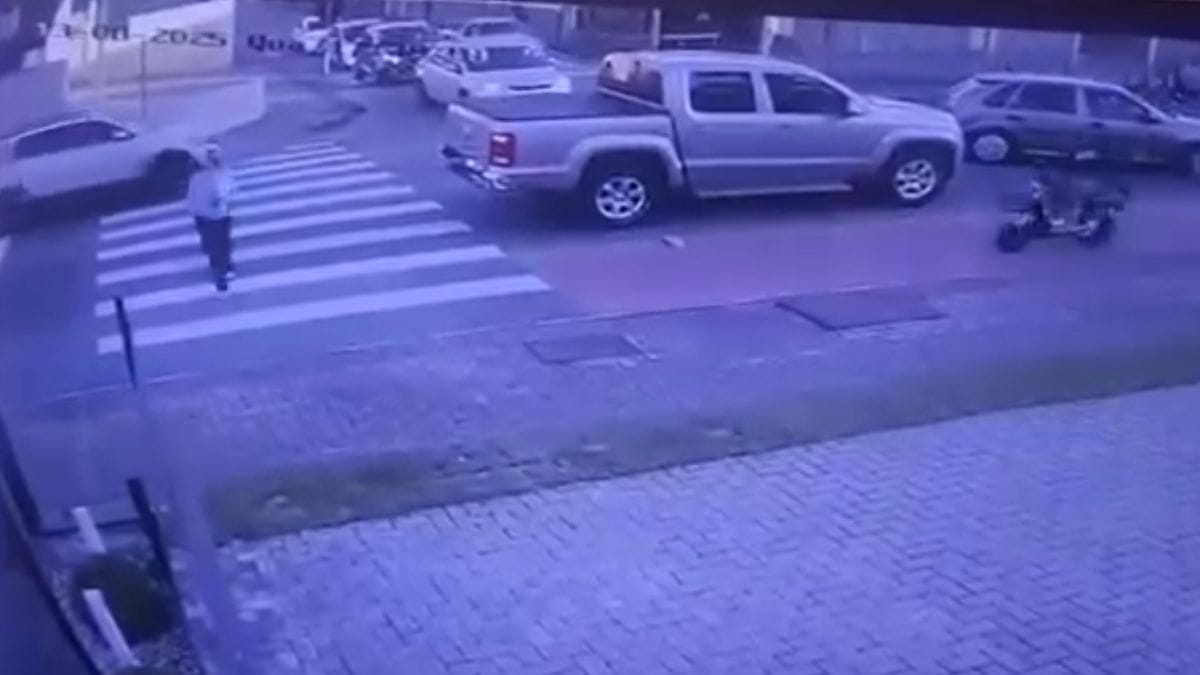 Uma mulher de 57 anos foi atropelada na faixa de pedestre, na quarta-feira (13), em Jaraguá do Sul. Ela foi atingida, por volta das 17h30min, por uma moto elétrica conduzida por uma adolescente de 15 anos. Uma câmera de monitoramento registrou o momento.