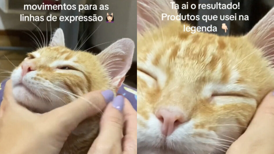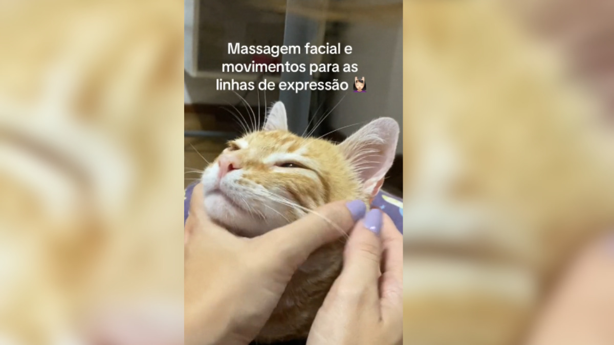 Para ajudar, Anny deixa Rosquinha lamber os seus dedos e depois passa no rosto do animal, fazendo massagens circulares. “Produtos: saliva do rosquinha. Já fizeram a skincare do seu gato hoje?”, diz a legenda do vídeo.