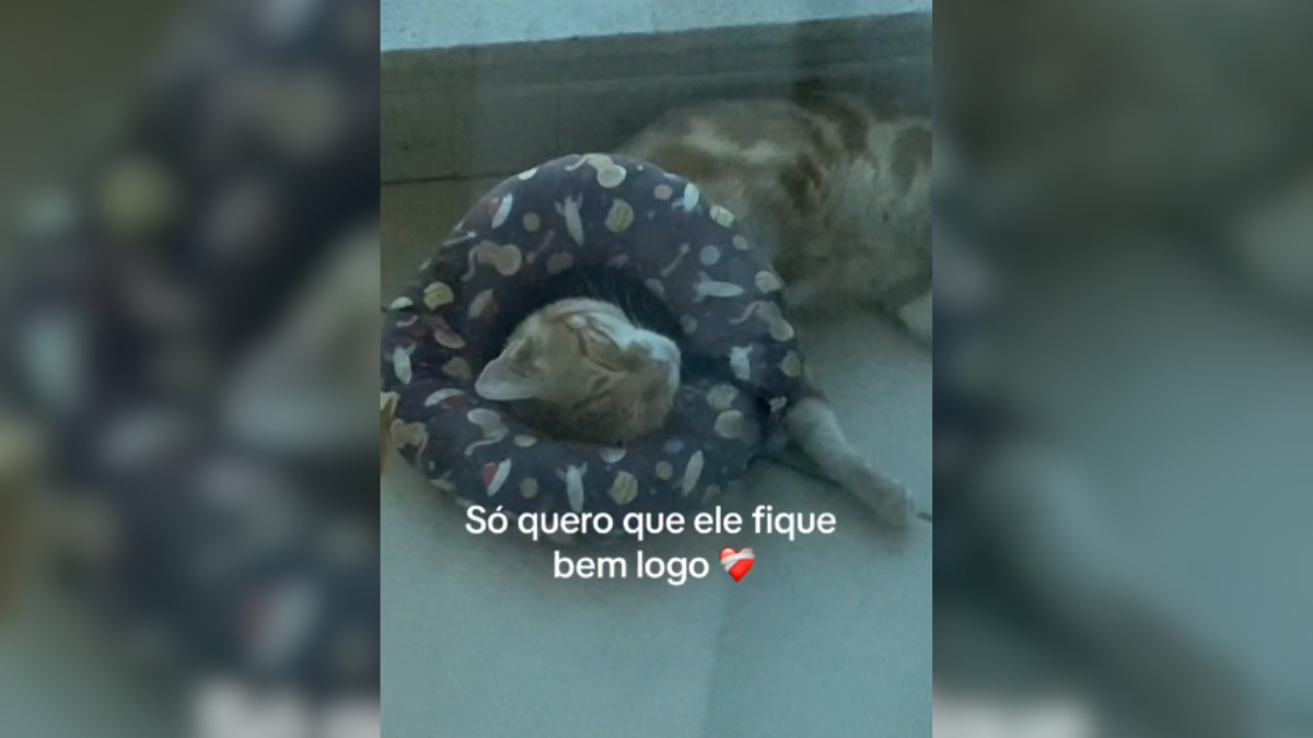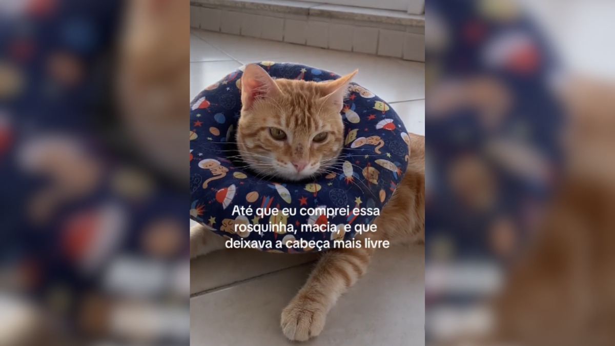 Devido ao colar no pescoço, Rosquinha não consegue fazer a própria “rotina de skincare” e, por isso, conta com ajuda da tutora para manter o rosto limpo. Segundo o site PetLove, os gatos costumam se lamber para se manterem limpos, além de ajudar a remover os pelos que ficam soltos pelo corpo.