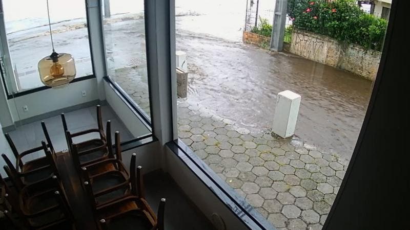 Imagens da câmera de monitoramento de uma pizzaria mostram o momento em que a água vinda do rompimento de uma lagoa artificial da Casan começa a tomar as ruas da Lagoa da Conceição em Florianópolis (veja abaixo).