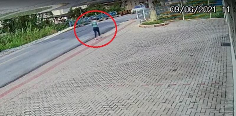 No vídeo, é possível ver a senhora caminhando em direção à estrutura pontualmente às 11h09min desta quarta-feira (9). Poucos segundos depois, a ponte desaba e a mulher cai em direção ao ribeirão. Ela chega a estender os braços e se desespera.