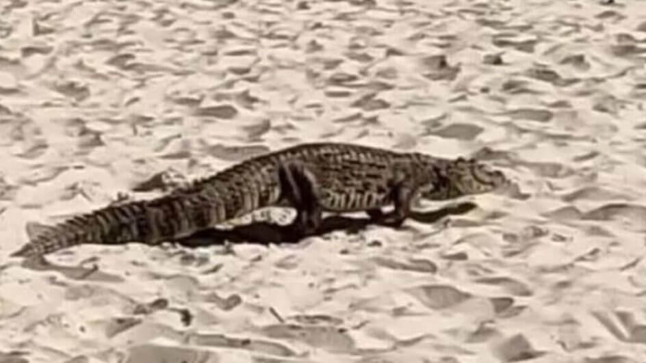 No vídeo (assista acima), enquanto banhistas apontam e gritam ao fundo, o jacaré aparece caminhando sobre a areia logo após sair de uma área de vegetação. É possível ver o réptil se aproximar de cadeiras e de um guarda-sol instalados mais próximo da água.