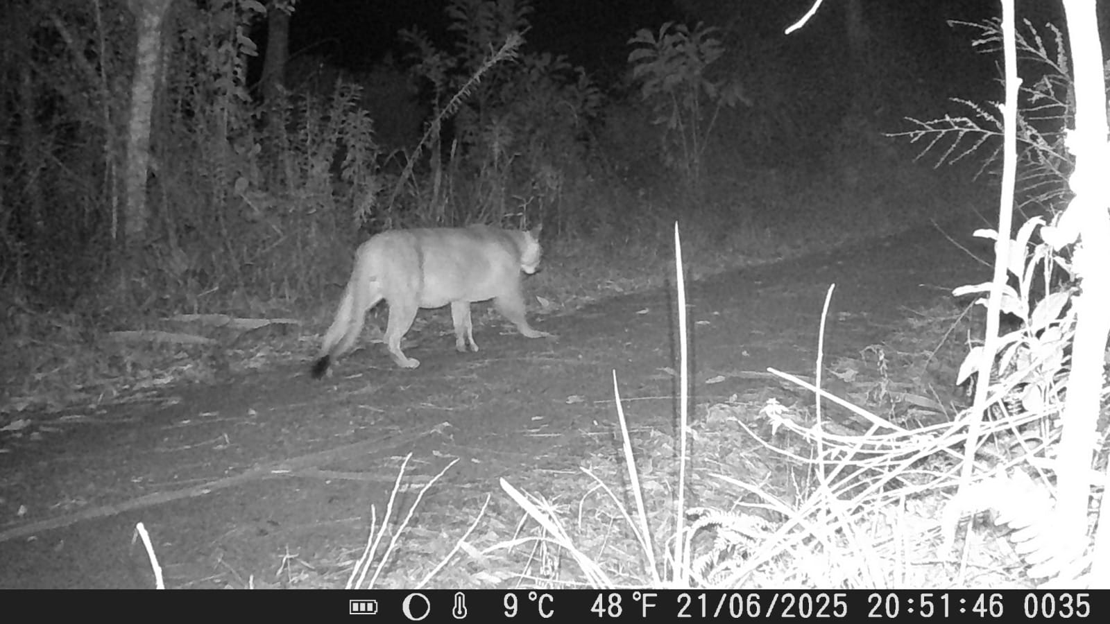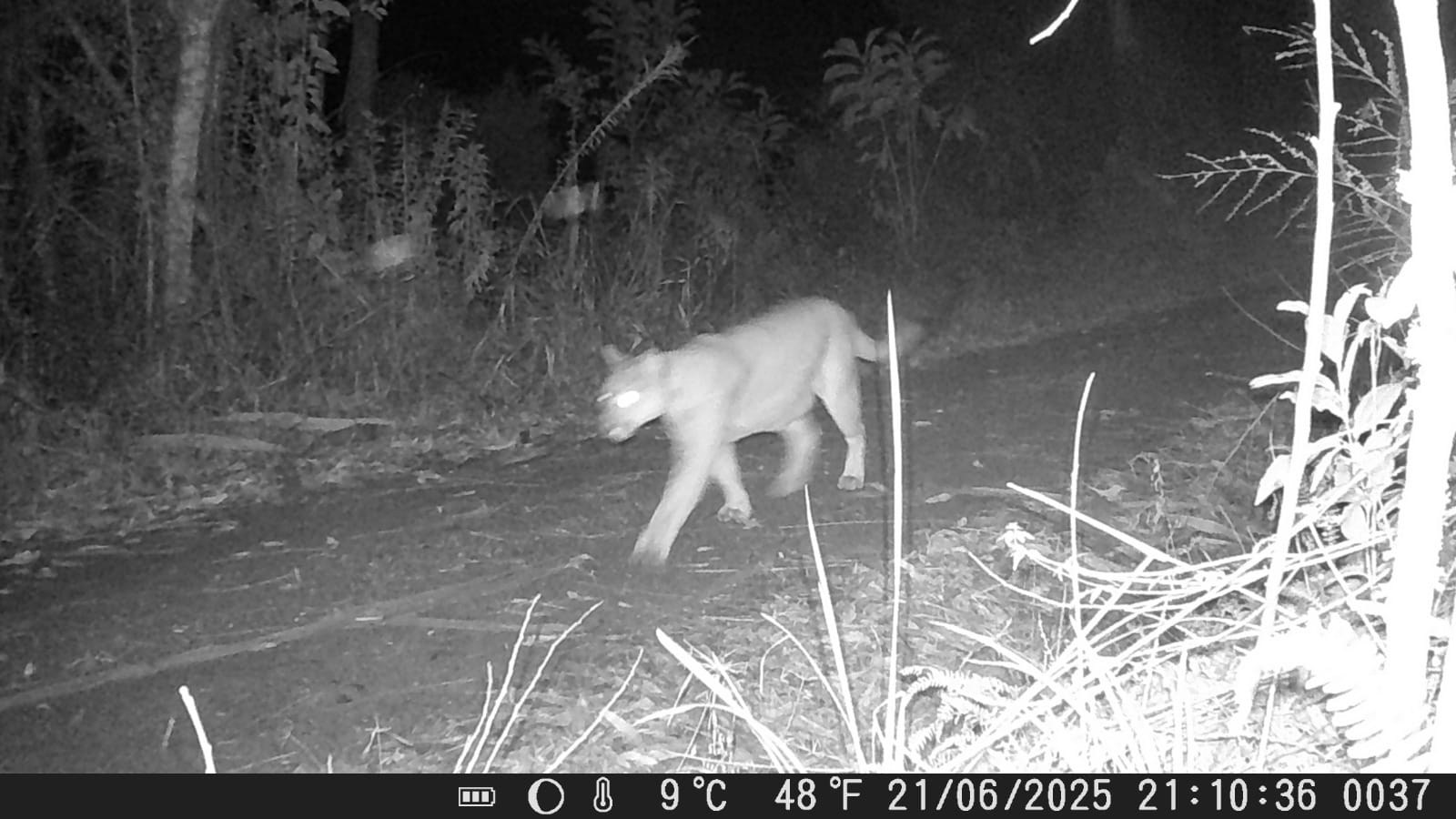 Uma onça-parda, também conhecida como puma, leão-baio e suçuarana, foi flagrado por uma câmera de monitoramento de fauna em uma área rural de Rio Bonito, em Rio dos Cedros. O animal caminhava pela propriedade do médico veterinário Cassiano Lenzi, que instalou a câmera na propriedade e compartilhou as imagens nas redes sociais para alertar os moradores.