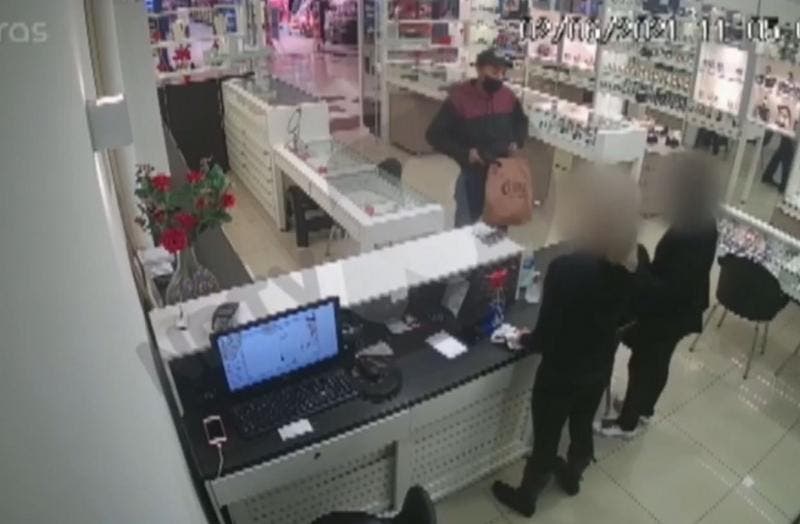 No vídeo, o homem usa um boné, com máscara no rosto, e segura uma sacola em uma das mãos. Com a outra, ele tira a arma da cintura e mostra para as funcionárias da relojoaria. Por alguns segundos, eles desaparecem da imagem após entrar na parte interna da loja, atrás do caixa.