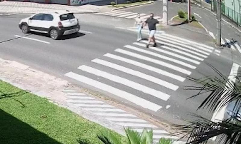 A câmera de segurança de um estabelecimento na Rua São Paulo registrou o momento em que pai e filha são atropelados na manhã desta quarta-feira (19) em Blumenau. As imagens confirmam que os dois atravessavam a rua na faixa de pedestres quando foram atingidos por um Fiat Ducato.