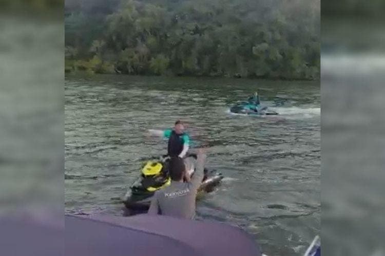 Uma mulher, que estava em uma das embarcações, grava a cena e chega a pedir para o homem ir embora. “Vaza daqui cara, vaza”, ela diz. Não é possível compreender o que os outros ocupantes da lancha e o piloto da moto falam.