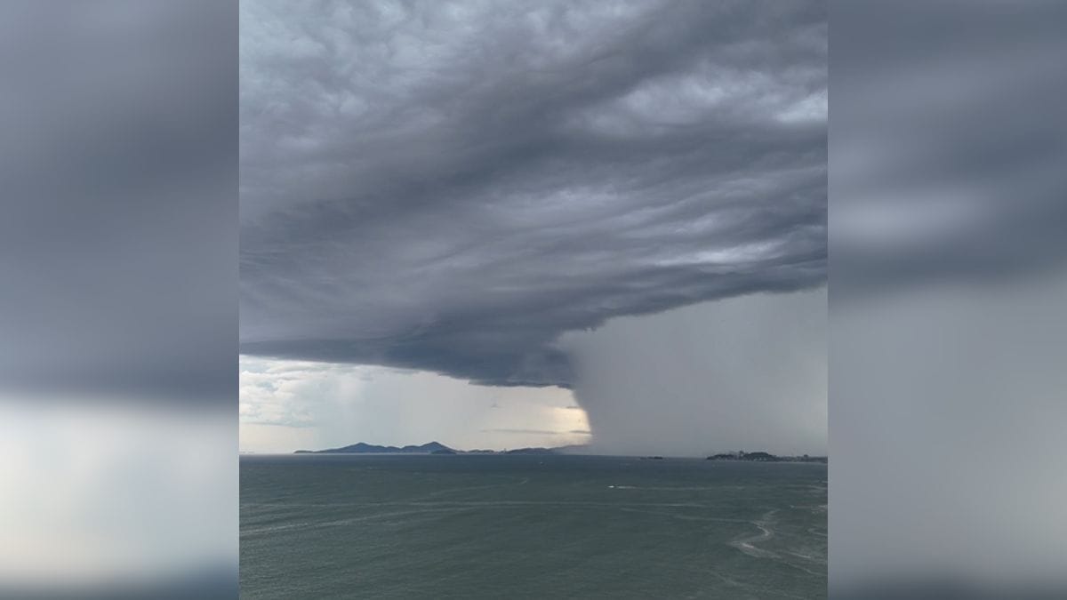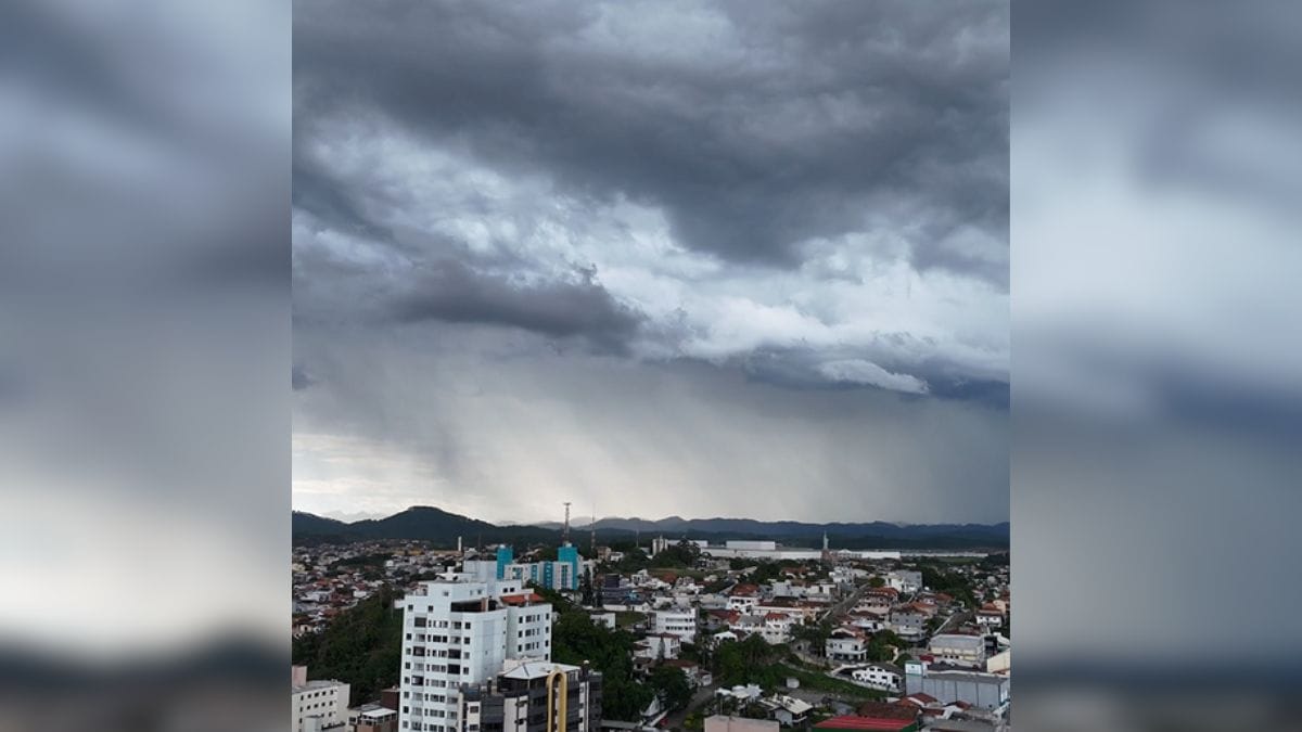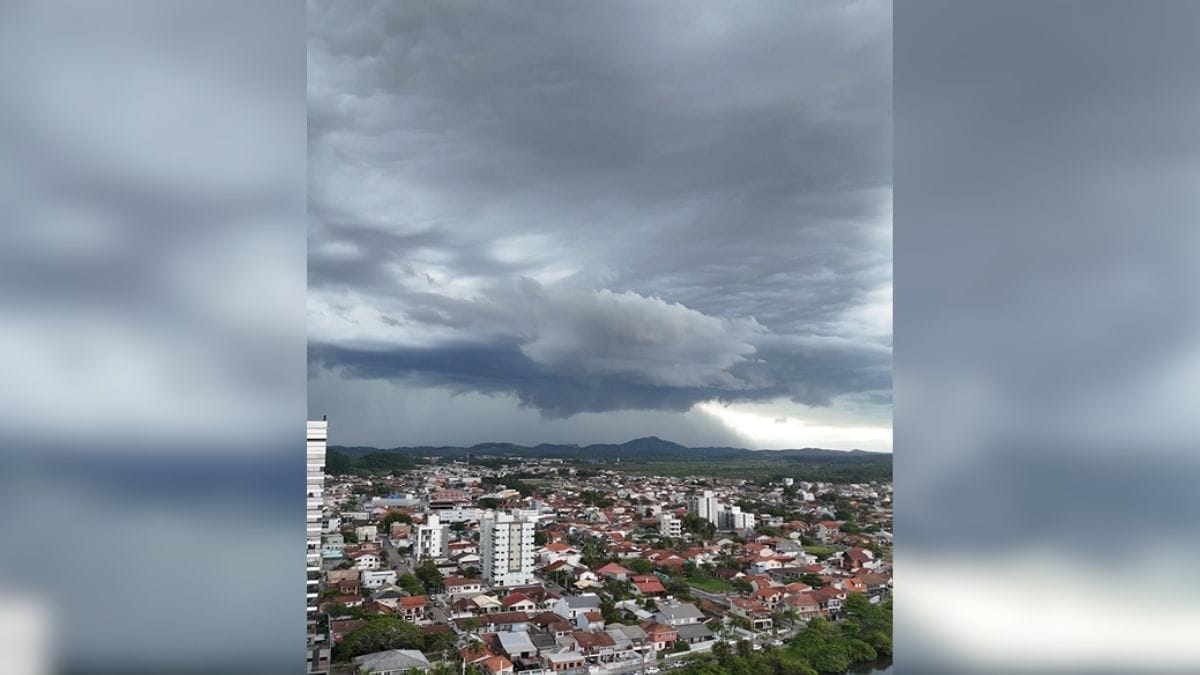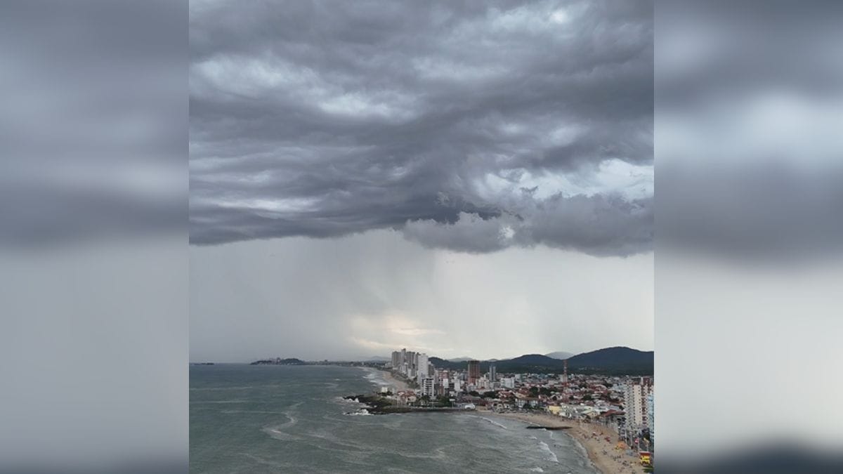 Após as temperaturas elevadas, a clássica “chuva de verão” tomou conta da orla da cidade por meio de uma nuvem de tempestade do tipo prateleira, conforme a Defesa Civil de Santa Catarina. O vídeo que repercutiu nas redes sociais foi gravado por volta das 16h40min.