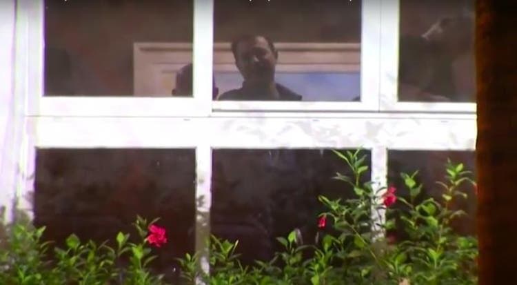 As imagens mostram o momento em que Carlos Moisés se aproxima de uma das janelas. Ele conversa com o grupo e parece tranquilo. Chega a ser servido por um garçom.