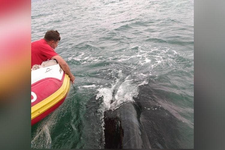 A baleia, adulta, foi encontrada com vida, mas com ferimentos nas nadadeiras, peito e cauda. Ela estava presa em aproximadamente 100 metros da rede de pesca. Para a retirada, foi necessário cortar a armadilha com uma faca.