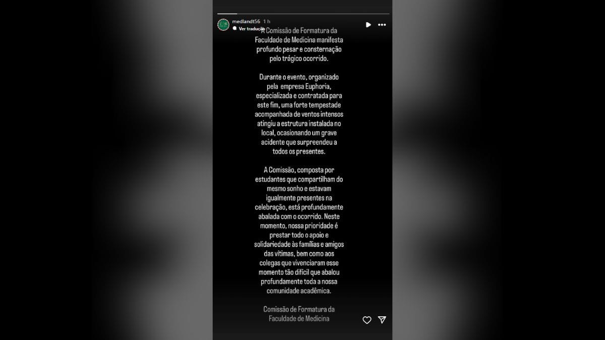“A Comissão de Formatura da Faculdade de Medicina manifesta profundo pesar e consternação pelo trágico ocorrido.