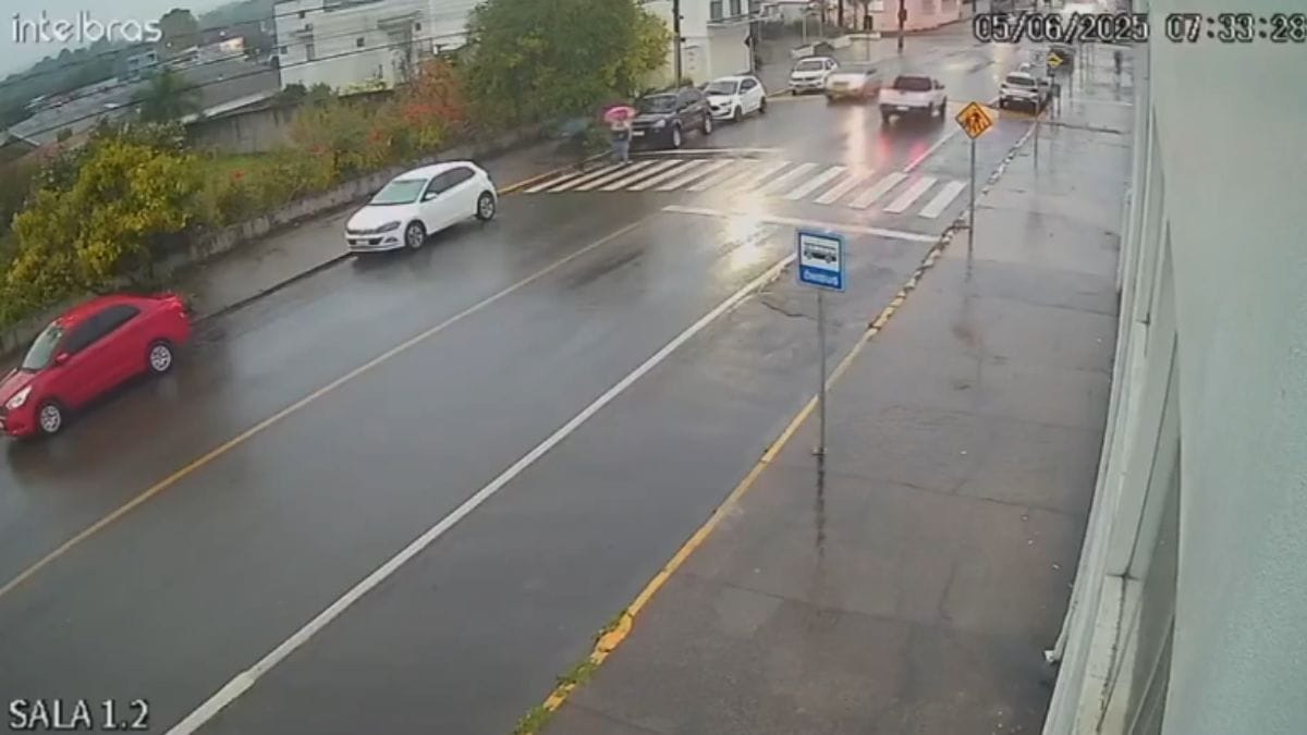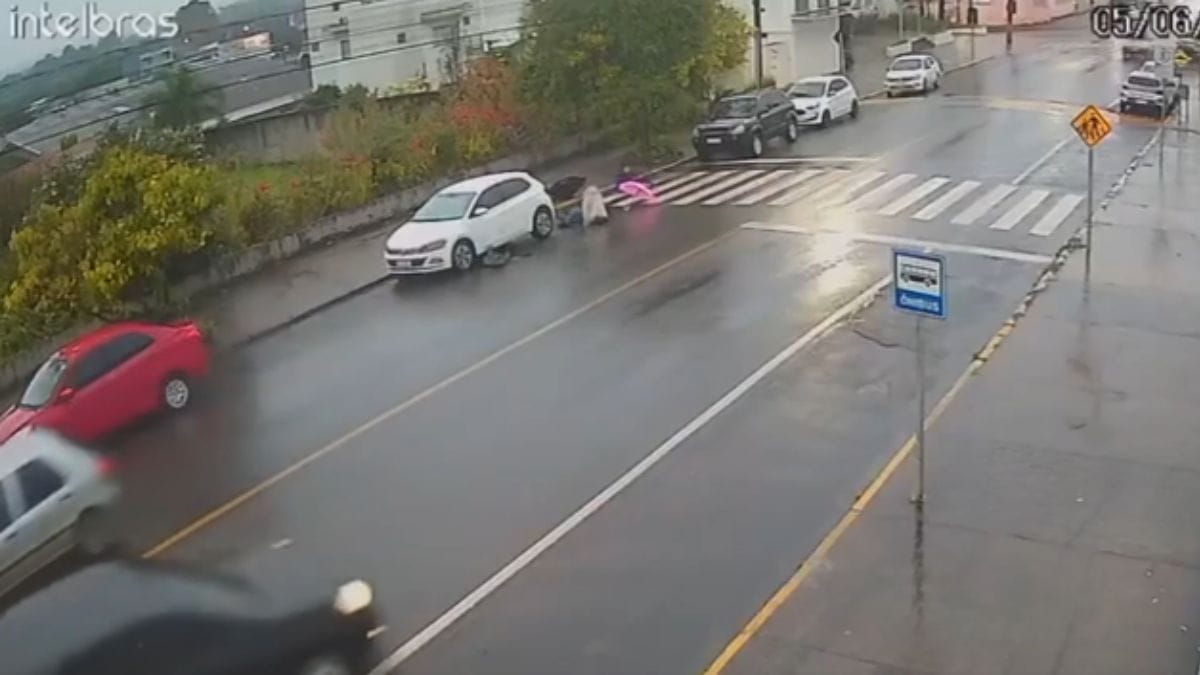 Uma câmera de segurança flagrou o momento em que duas mulheres foram atropeladas na faixa de pedestre em Canoinhas, no Planalto Norte de Santa Catarina. Após atingir as duas vítimas, o motorista do carro fugiu do local, informou a Polícia Militar. O atropelamento ocorreu por volta das 7h30 de quinta-feira (5).