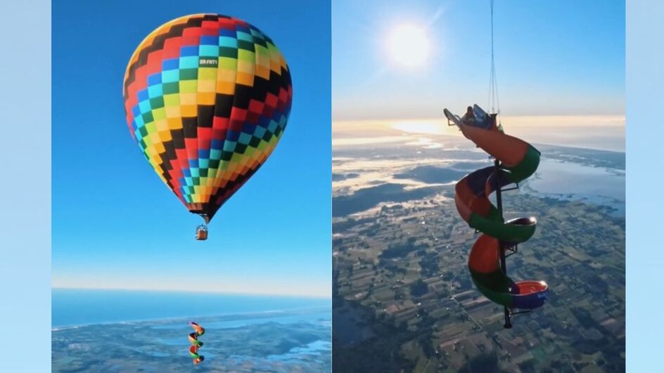 Um grupo de paraquedistas pulou de um toboágua a três mil metros de altura em Praia Grande, no Extremo Sul de Santa Catarina. O equipamento foi içado por um balão de ar quente ao nascer do sol.