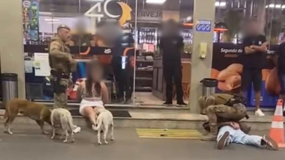 Uma mulher se aproxima do local, aparentemente filmando com o celular. Outro policial grita para ela se afastar, e logo em seguida a puxa pelo braço e a imobiliza com violência no chão. A moça repete diversas vezes: “calma, moço, eu não fiz nada”.