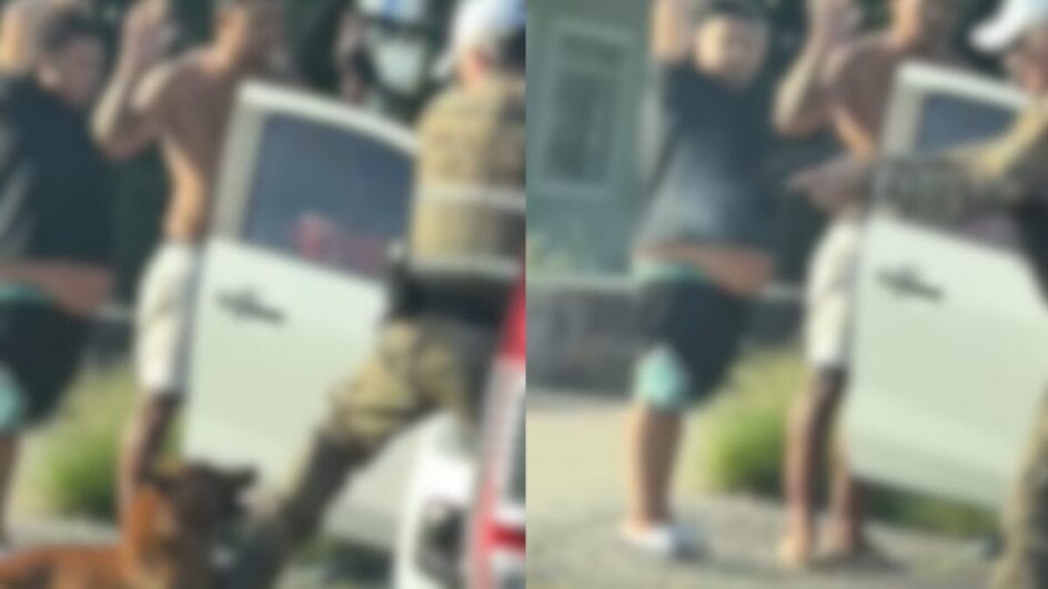 Nas imagens, é possível ver a abordagem policial contra o grupo, com o registro de dois homens com as mãos para o alto. Um policial aponta a arma para eles e chuta a frente de um carro que se move. Logo em seguida, um cachorro se aproxima da perna do policial e tenta morder, ele o afasta com um chute e depois atira em direção ao animal.