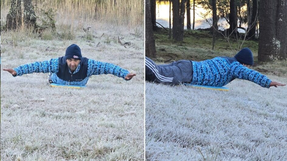 O “caçador de geada” aproveitou a situação e “surfou” nos campos, usando uma prancha de bodyboard, normalmente utilizada em praias. Um vídeo registrado mostra o momento. Confira: