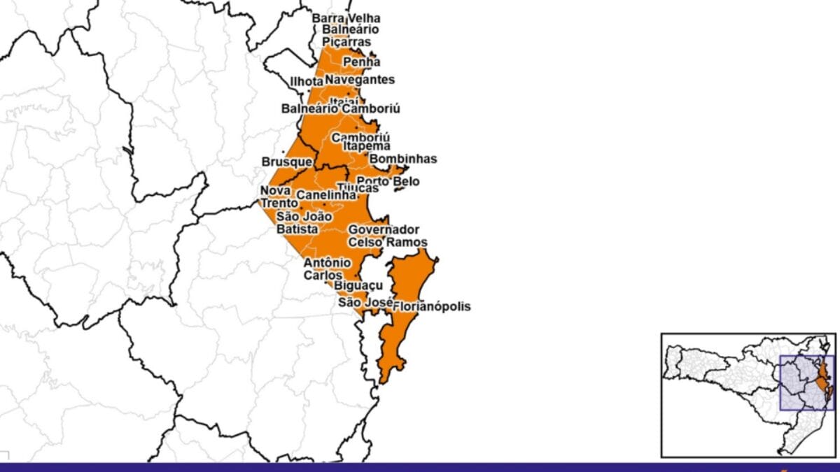 Às 22h46min, a Defesa Civil de Santa Catarina emitiu um alerta de atenção para a região, com risco de queda de granizo, rajadas de vento e alagamentos. O alerta vale para as próximas três horas, ou seja, até 1h46min desta quarta-feira (8), também para cidades do Litoral Norte.