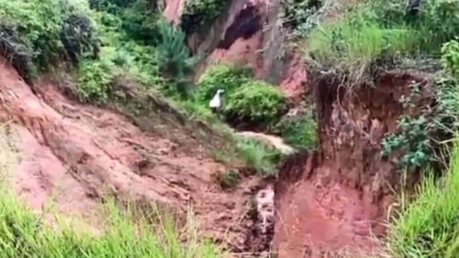 O animal estava entre o fundo de erosão de uma área rural, onde aconteceu um deslizamento de terra, e a pastagem. Os bombeiros avaliaram que não havia condições de retirar o bicho pela área mais baixa por conta dos degraus do percurso. Por isso, eles optaram por realizar a retirada pela parte alta do terreno.