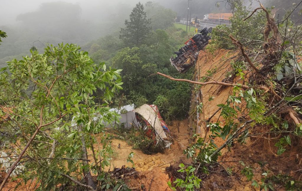 Além disso, há automóveis que estão sobre caminhões e meio à terra, lama e pedaços de árvores quebradas. Uma das carretas ficou pendurada entre a pista e o barranco. O resgate pode durar dias, segundo as autoridades.