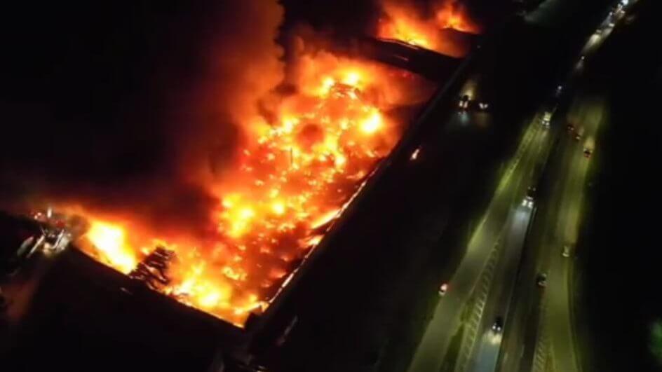 Um incêndio de grandes proporções atingiu o galpão de uma empresa em Barra Velha no início da noite de quinta-feira (25). O depósito atingido fica às margens da BR-101, no Km 95. Imagens gravadas no local mostram o momento em que as chamas consomem parte da estrutura da companhia que possui 120 mil m² no total. Desses, 10 mil m² ficaram destruídos e o telhado da área afetada cedeu.