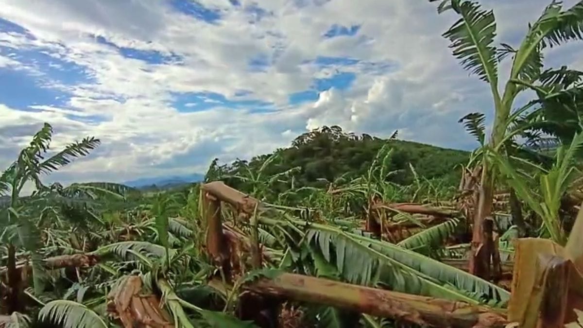 Bananais ficaram destruídos após um forte temporal que atingiu São João do Itaperiú, no Norte de Santa Catarina, na tarde de domingo (11). Além das lavouras afetadas, estragos também foram registrados em outras regiões da cidade, com casas destelhadas e quedas de árvores.