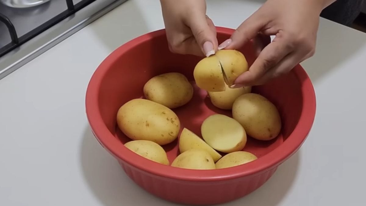 Primeiro, lave e seque bem as batatas. Se preferir, corte-as em palitos ou em cubos uniformes para cozimento homogêneo.